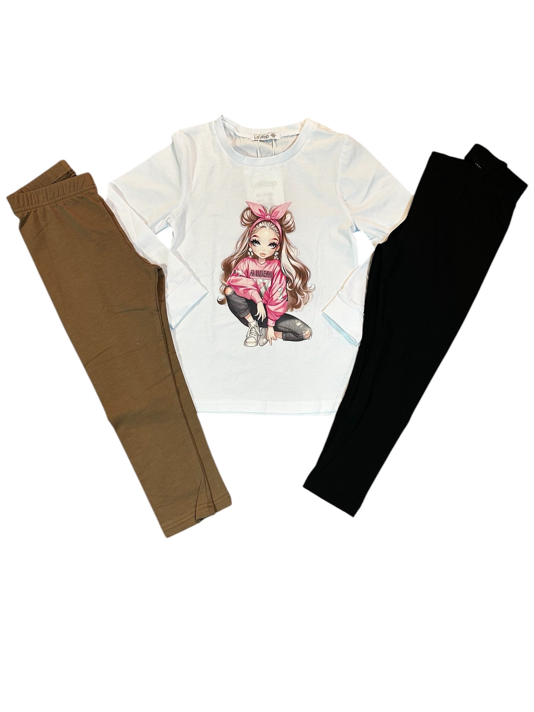 Completo in puro cotone composto da maxi maglia bianca e leggins. Disponibile con leggins beige o nero lisci. Da 4 a 12 anni