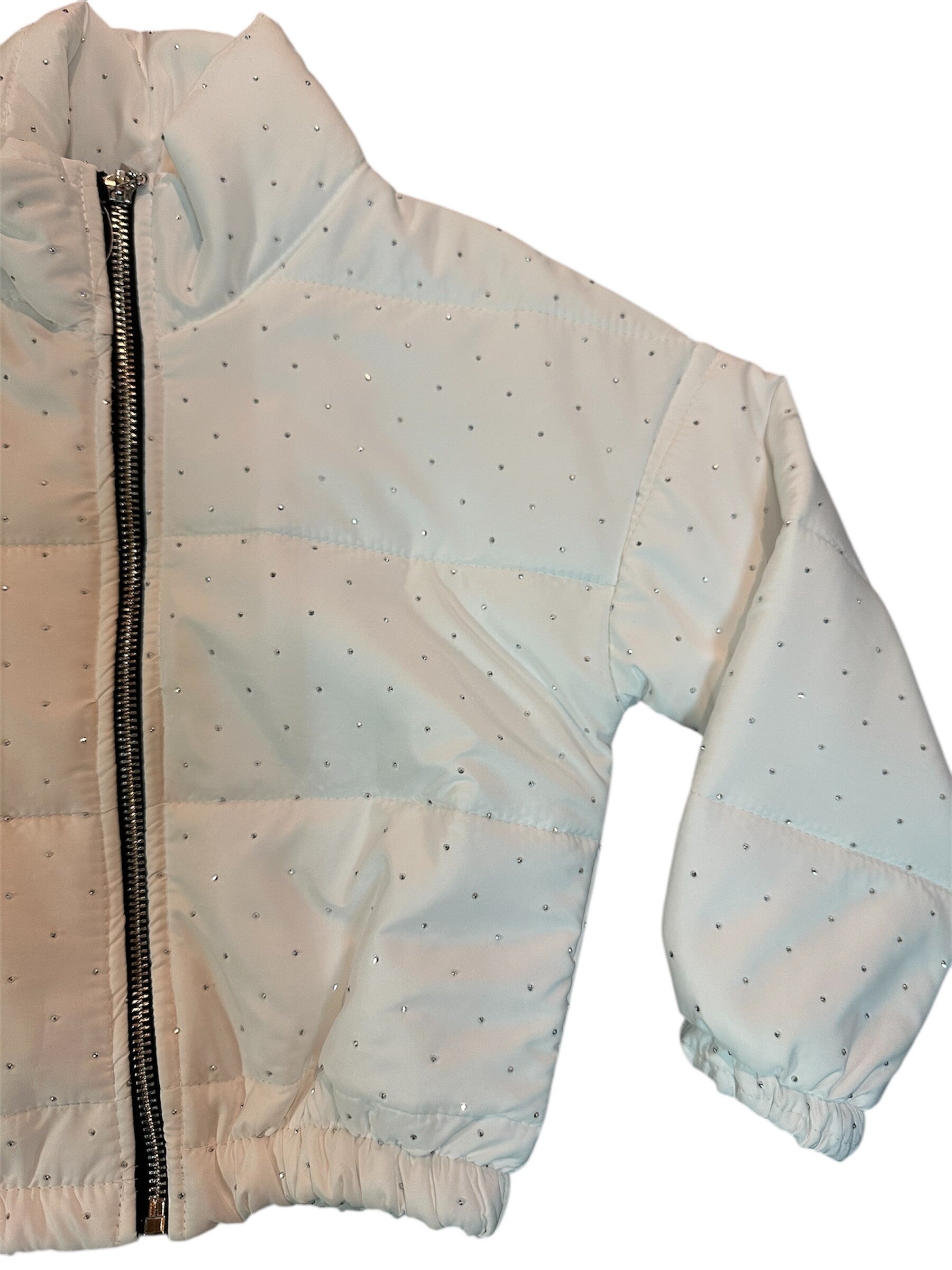 Giacca 100 grammi perfetta per la mezza stagione resistente al vento, modello a scatoletta teenager, con collo alto. Colore bianco con brillantini