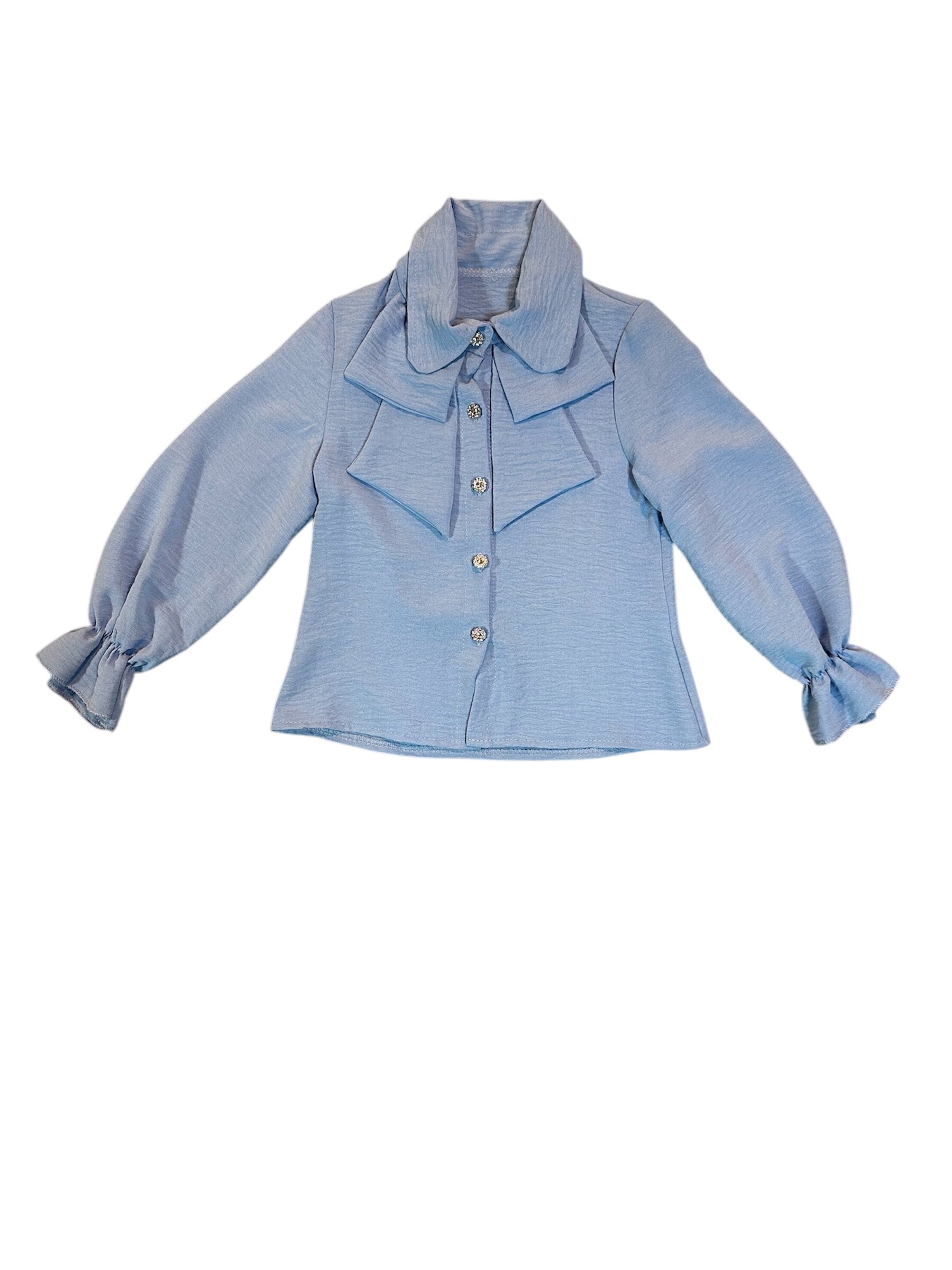 Camicia azzurra con bottoni gioiello, azzurro pastello, con maniche elasticizzate. Da 4 a 14 anni