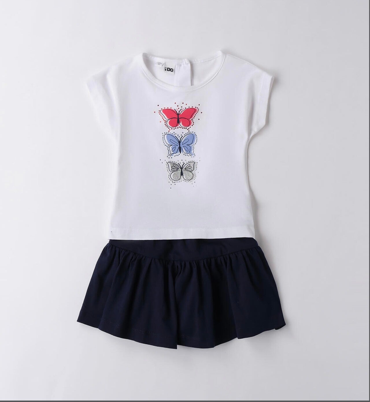 Completo puro cotone IDo composto da t shirt base bianca con stampa farfalle nei colori del rosso e blu, pantaloncini effetto gonna blu notte. Da 2 a 8 anni.