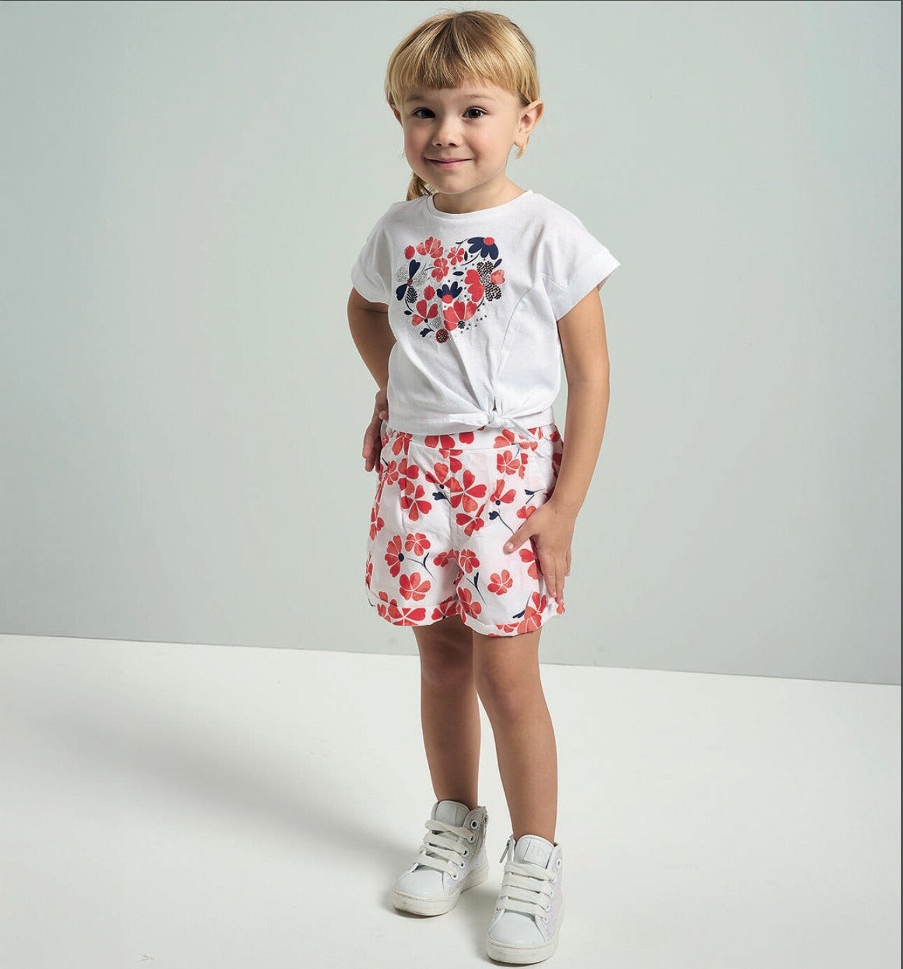 Completo in cotone IDo composto da t shirt base bianca a scatoletta con stampa fiori rossi, pantaloncini elasticizzato in vita fantasia fiori rossi. Da 2 a 8 anni
