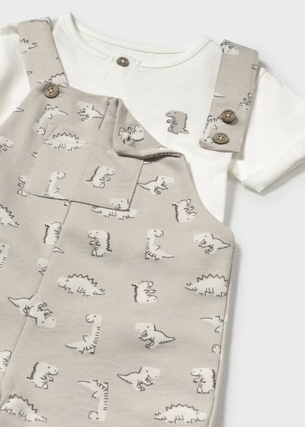 Salopette in cotone Mayoral composto da salopette con stampa Dino e t shirt base bianca. Da 6 a 36 mesi