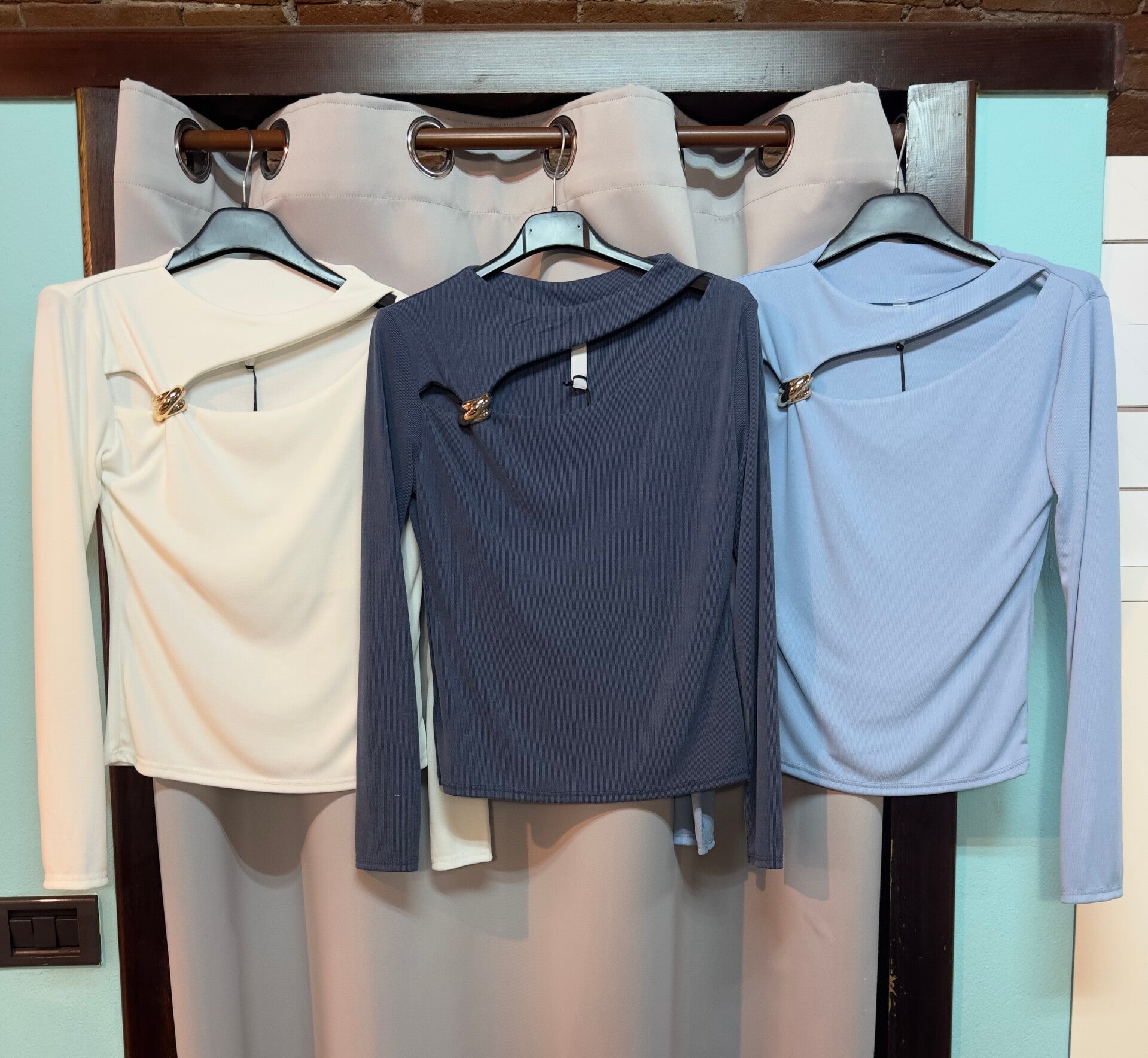 Maglia a costine elasticizzata taglia unica vestibilita slim (da XS a M) con buco e nodo in oro. Disponibile in vari colori