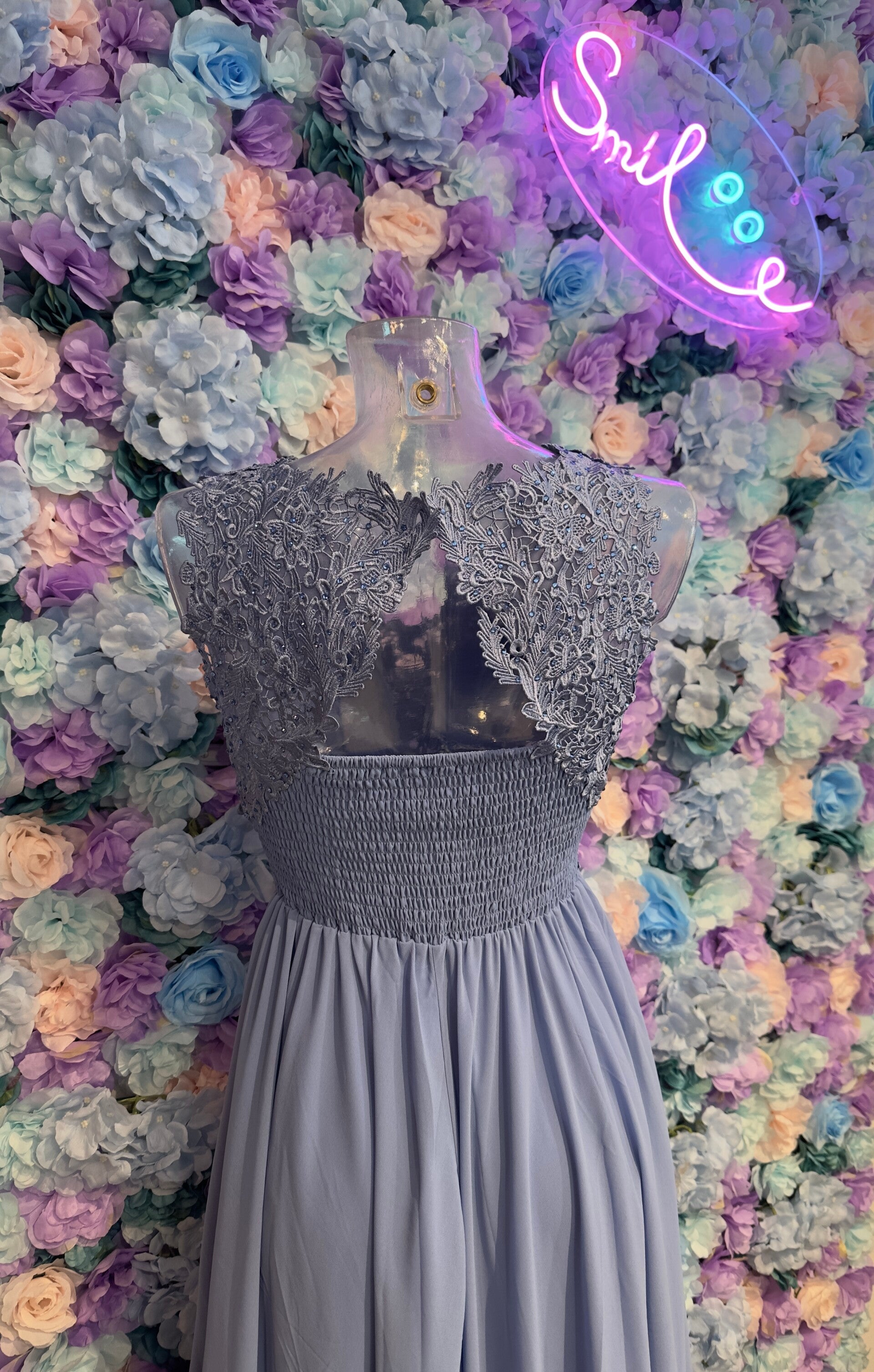 Abito strutturato con corpetto decorato con pizzo e brillantini tono su tono, elasticizzato dietro con nido d ape. Gonna scivolata. Taglia unica veste da XS a M