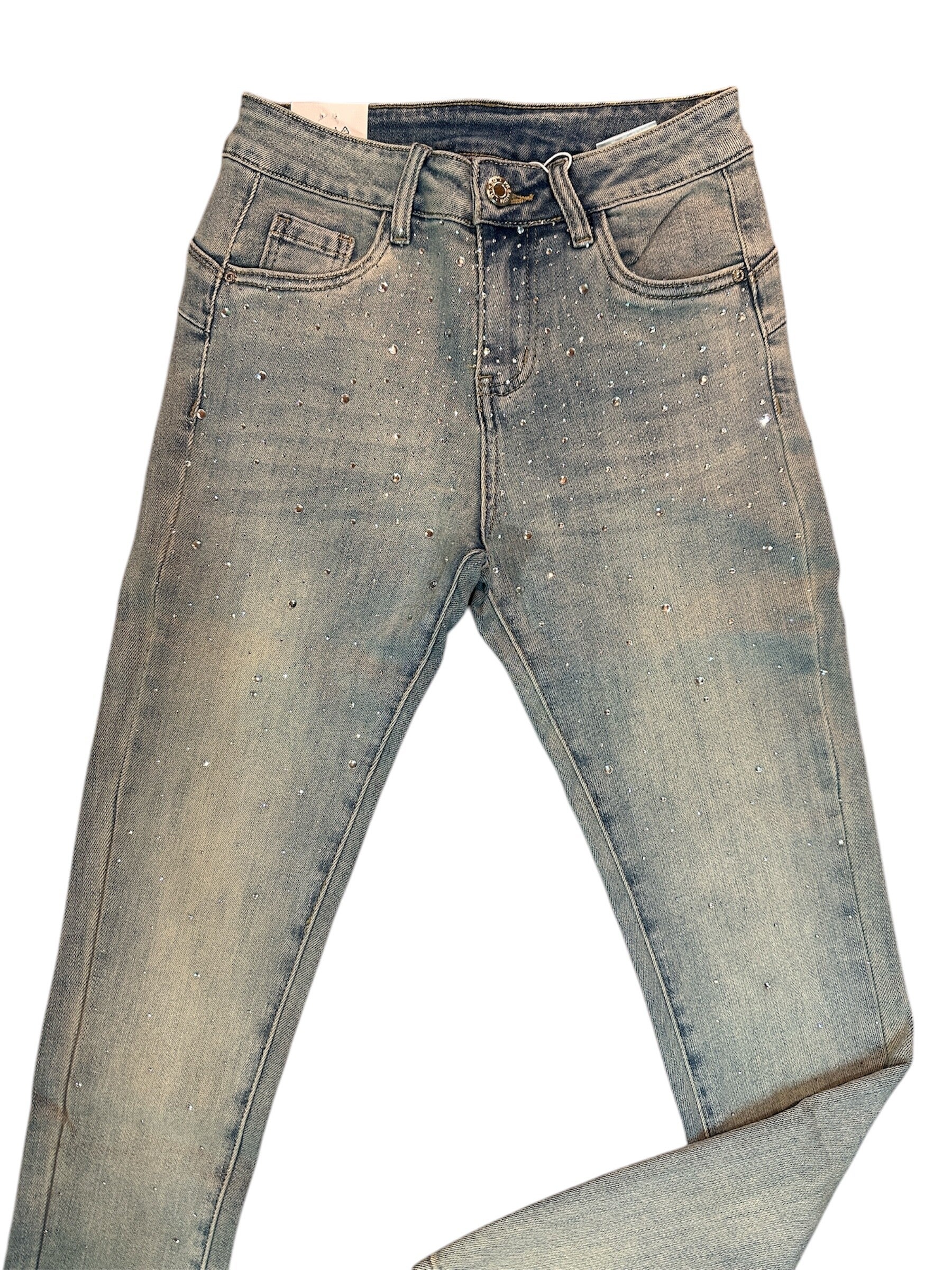 Jeans elasticizzato gamba stretta lavaggio chiaro con brillantini. Da XS a XL vestibilità slim