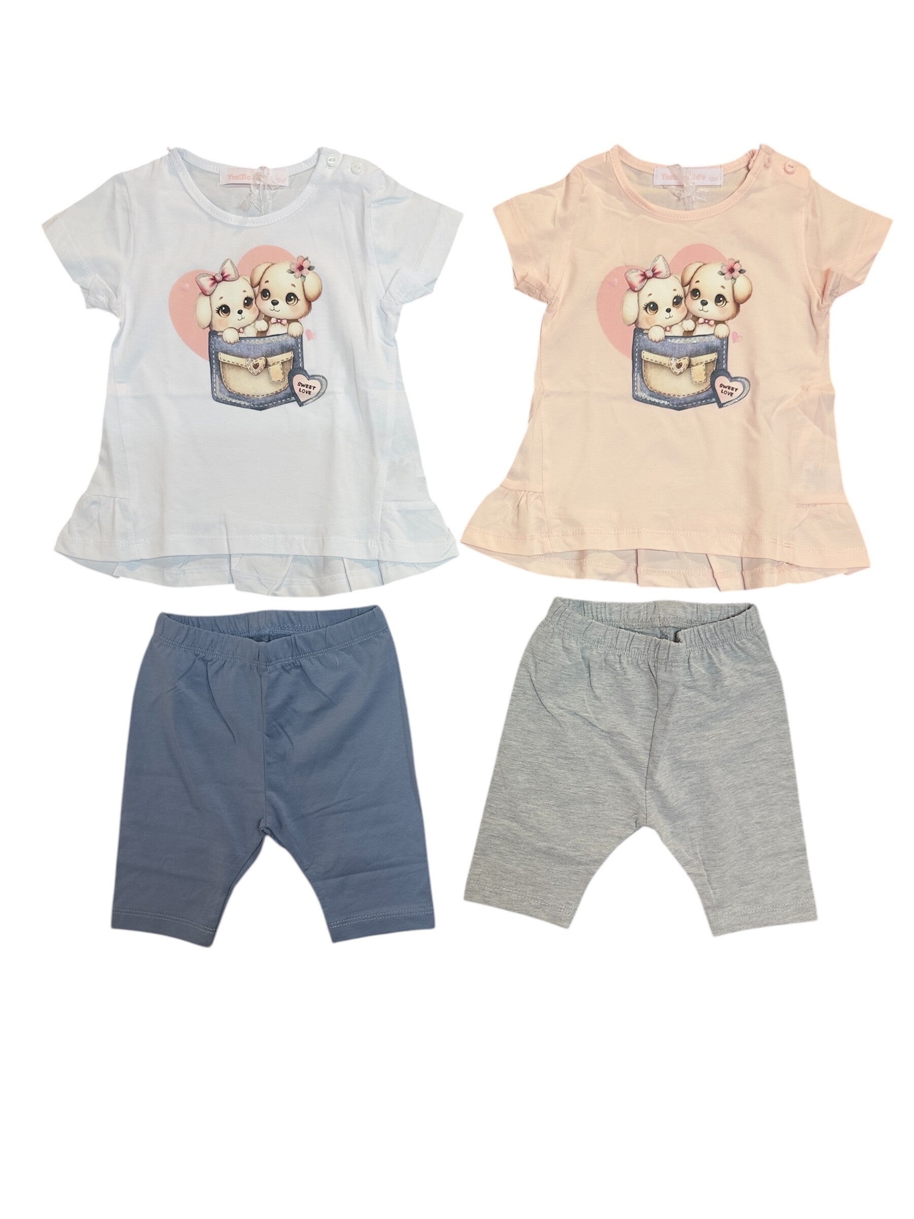Completo puro cotone composto da maxi t shirt e leggins al ginocchio. Stampa cagnolini. Disponibile da 12 a 36 mesi, in variante rosa antico/grigio o bianco/azzurro