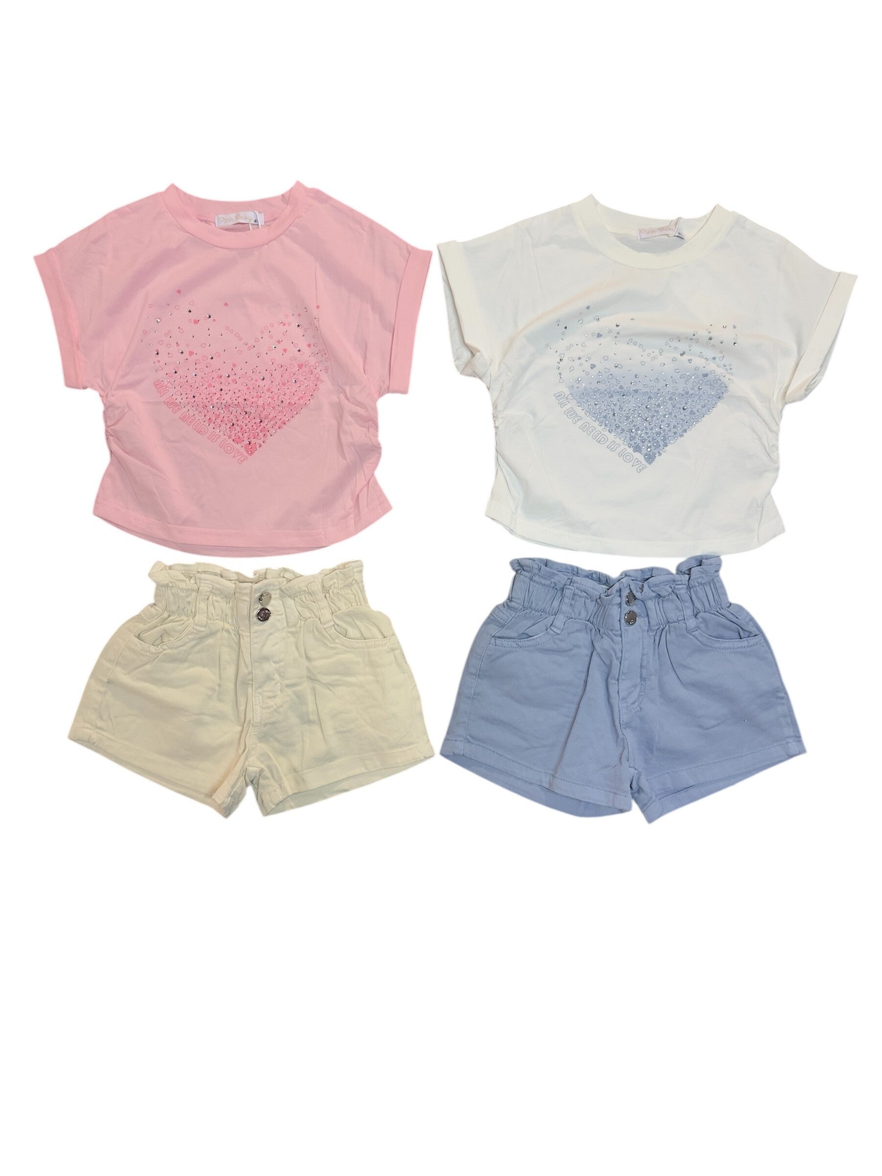 Completo in puro cotone composto da t shirt e shorts in tessuto elasticizzati. Da 4 a 12anni, disponibile in rosa/burro o bianco/azzurro polvere.