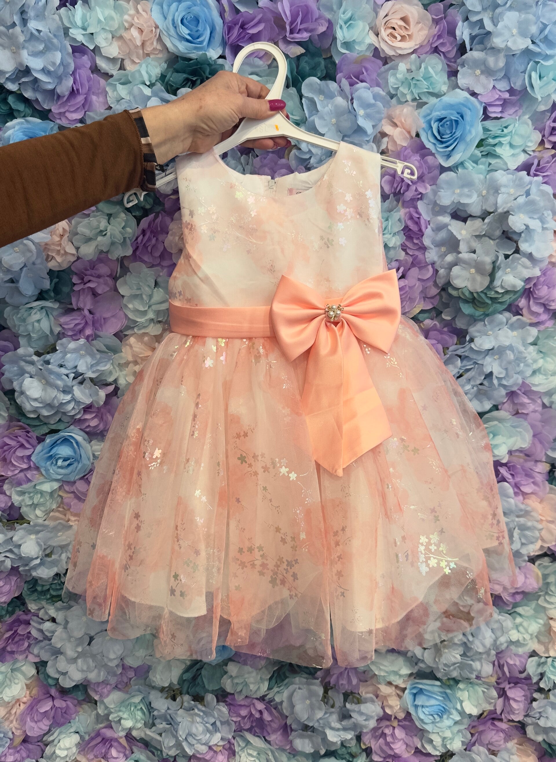 Abito in tulle con zip dietro e fiocco davanti, pomposo. Disponibile in fucsia o rosa pesca.Da 4 a 14 anni