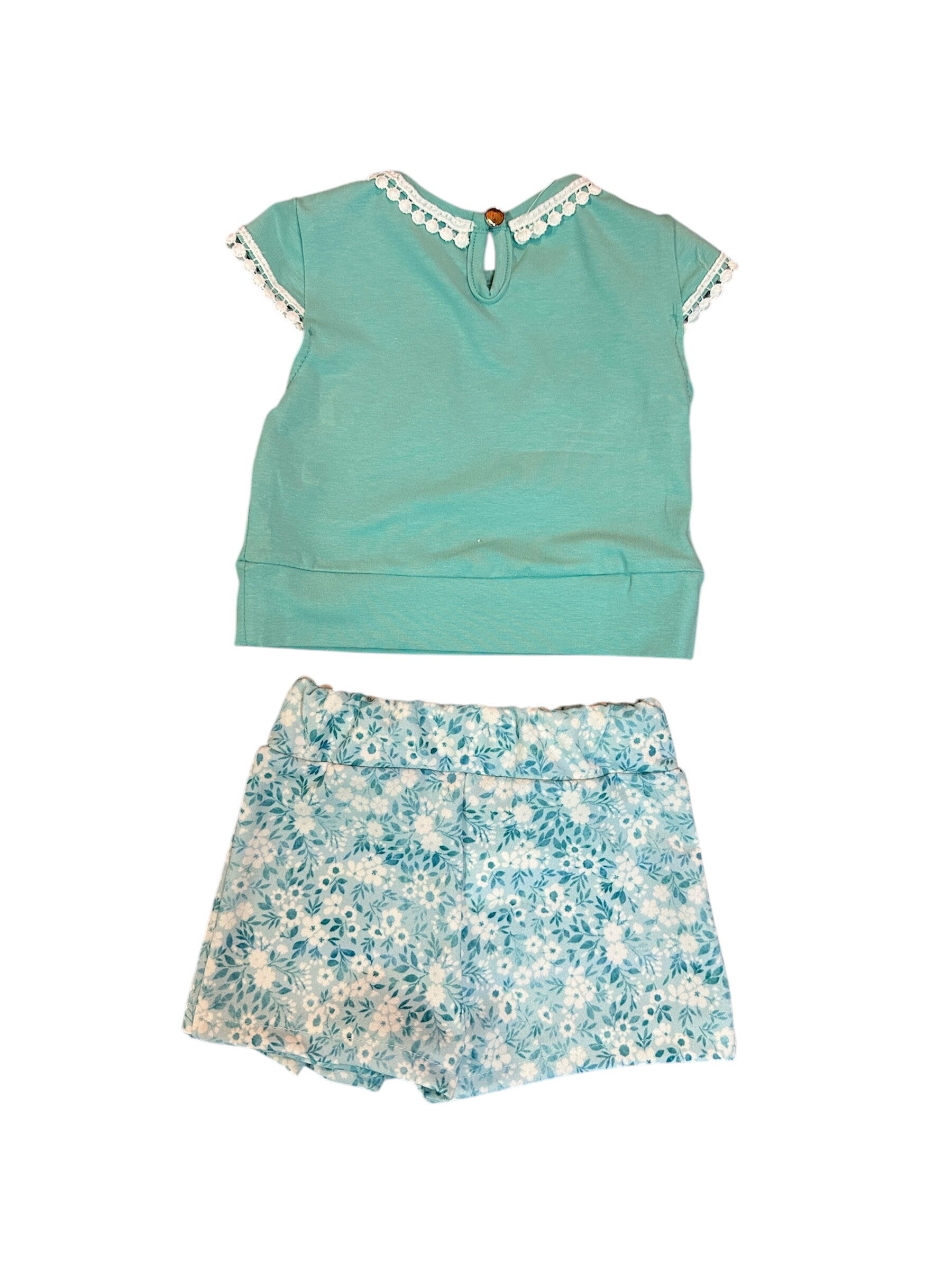 Completo composto da canotta sfiziosa cotone colore tiffany con bottone dietro, pantaloncino effetto gonna elasticizzato in vita. Da 9 a 36 mesi