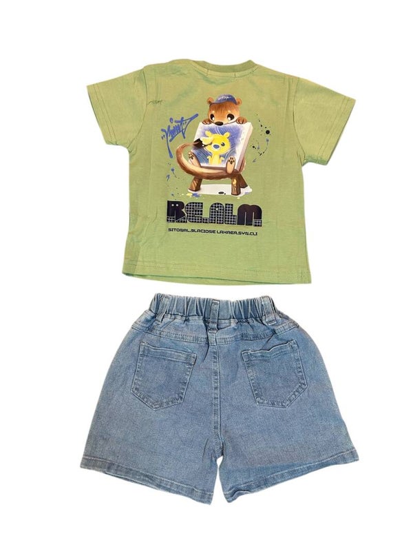 Completo cotone composto da t shirt verde salvia con stampa su schiena, jeans morbido tutto elasticizzato in vita. Da 12 a 36 mesi