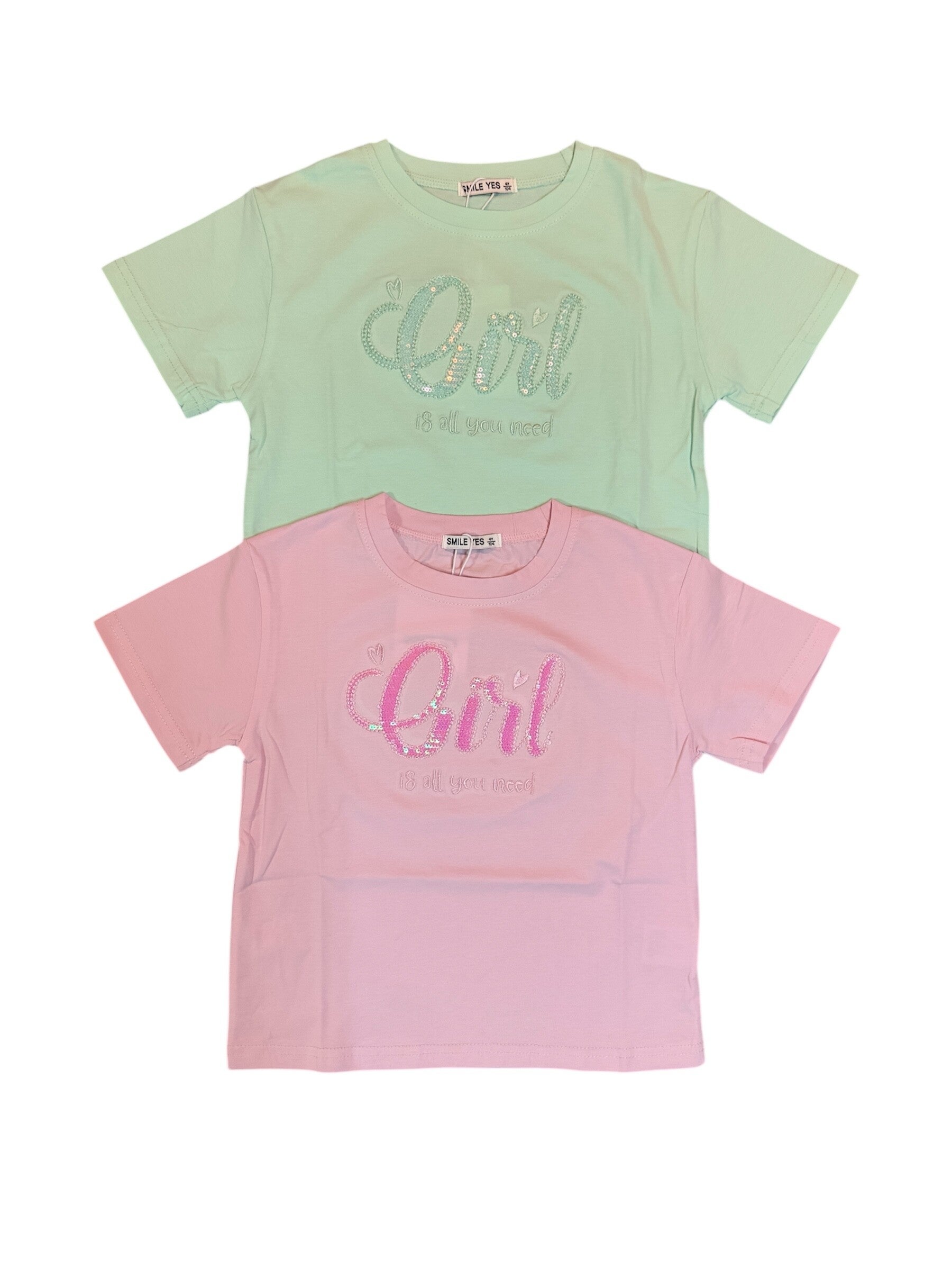T shirt in puro cotone a scatoletta disponibile in verde acqua o rosa. Da 4 a 12 anni