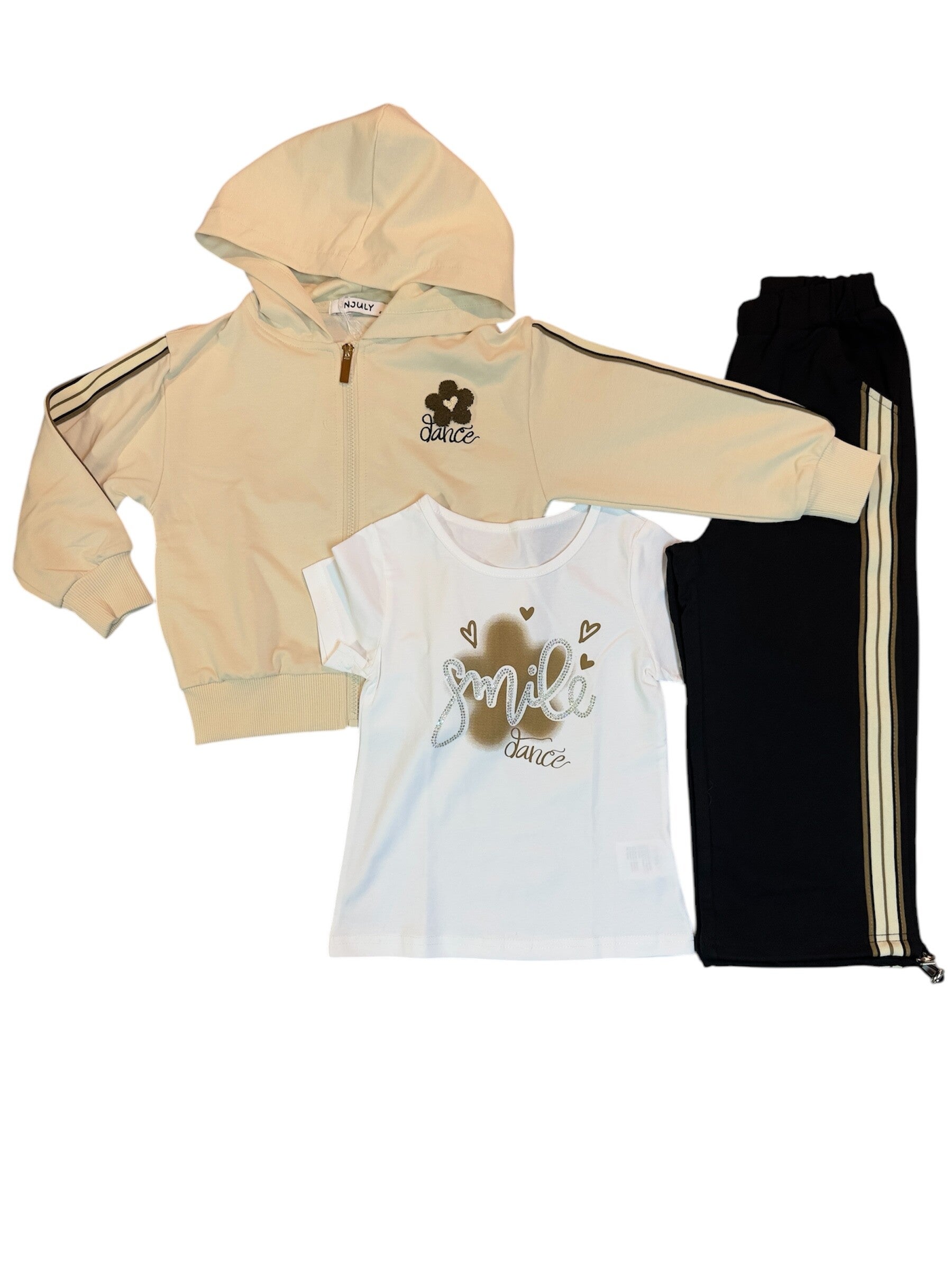 Tuta in puro cotone composta da felpa con zip e cappuccio, t shirt e pantalone gamba larga che si può stringere sotto. Colore beige con nero. Da 4 a 12 anni.