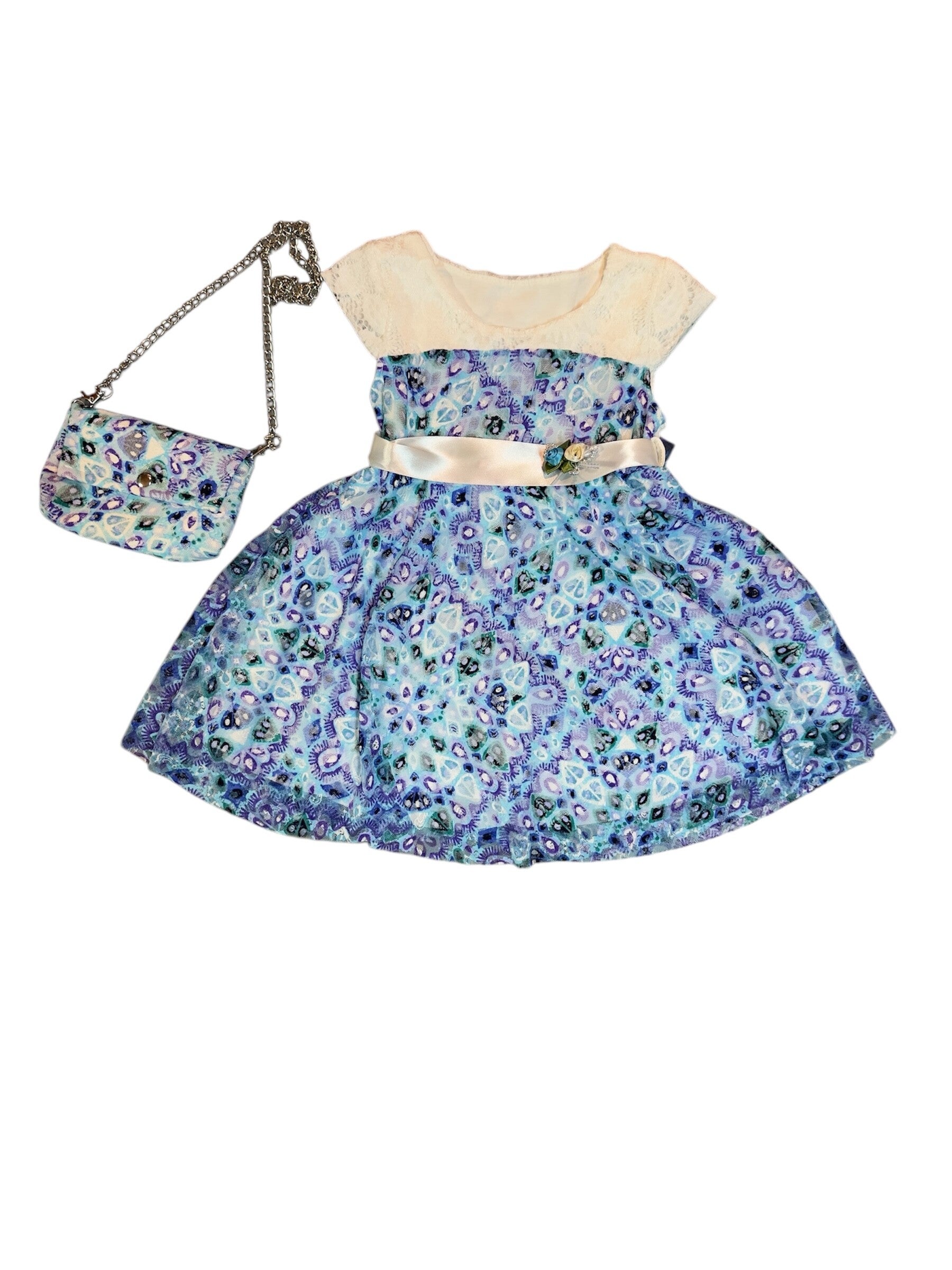 Abito foderato in cotone super comodo ed elegante, con cintura in raso removibile. Da 4 a 14 anni con borsetta inclusa.