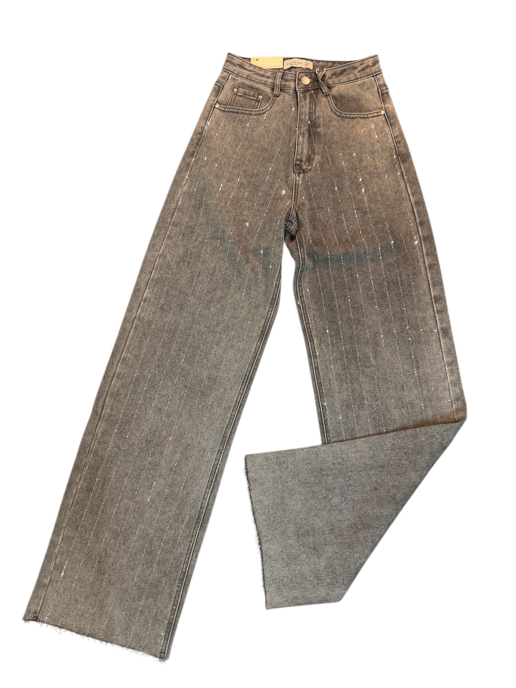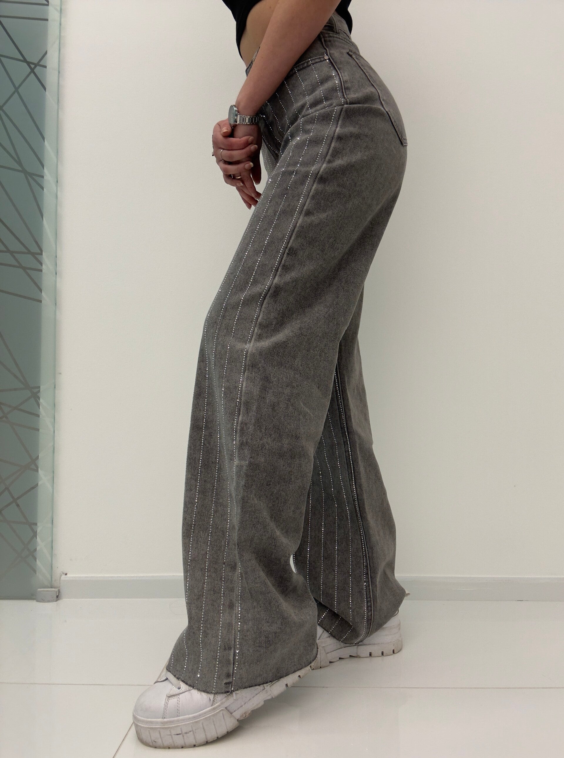 Jeans a vita alta elasticizzato, con gamba larga sfrangiato in fondo. Super morbido. Da XS a XL