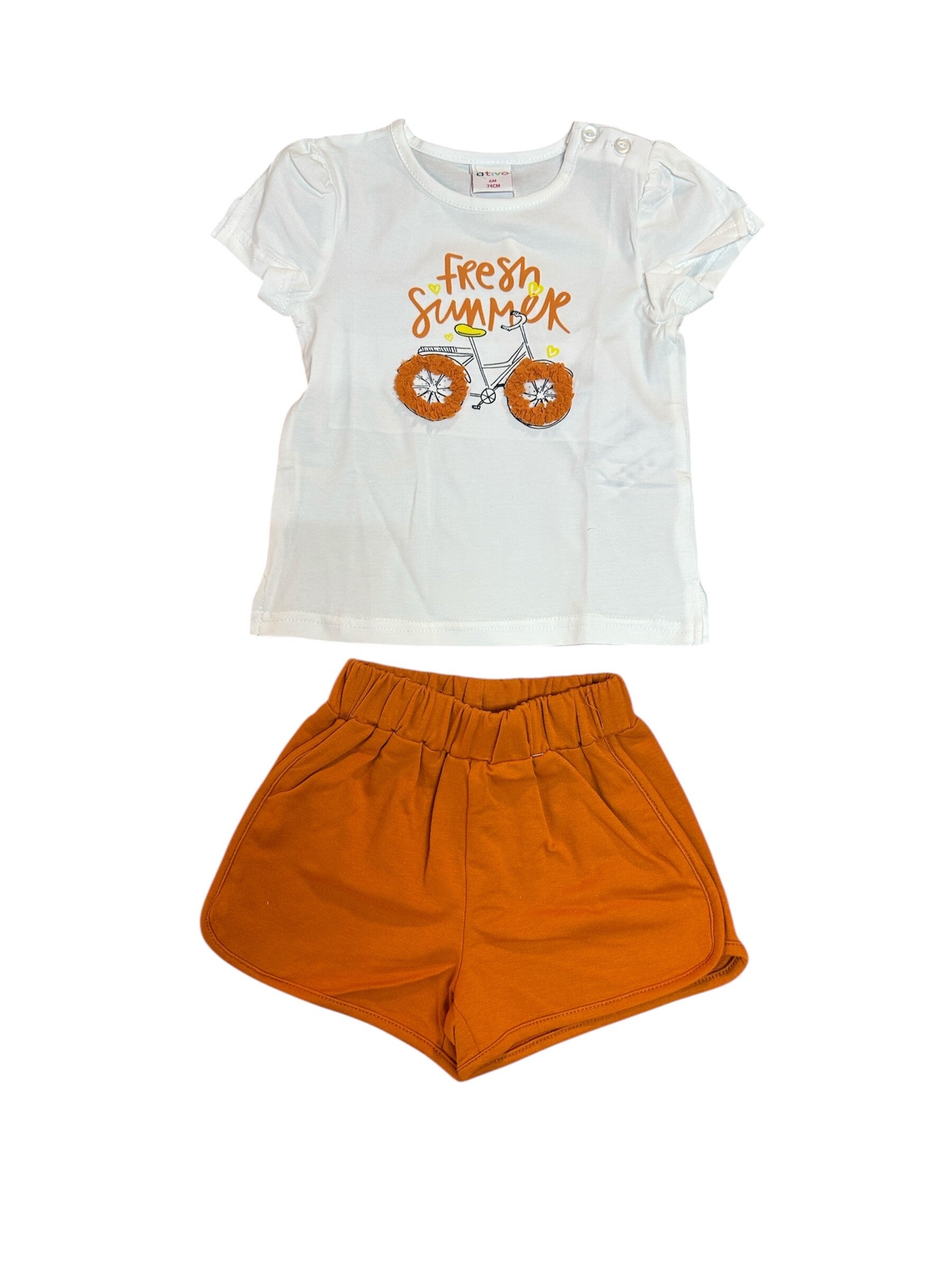 Completo in puro cotone composto da t shirt e bermuda morbidi. Colore bianco con arancio.