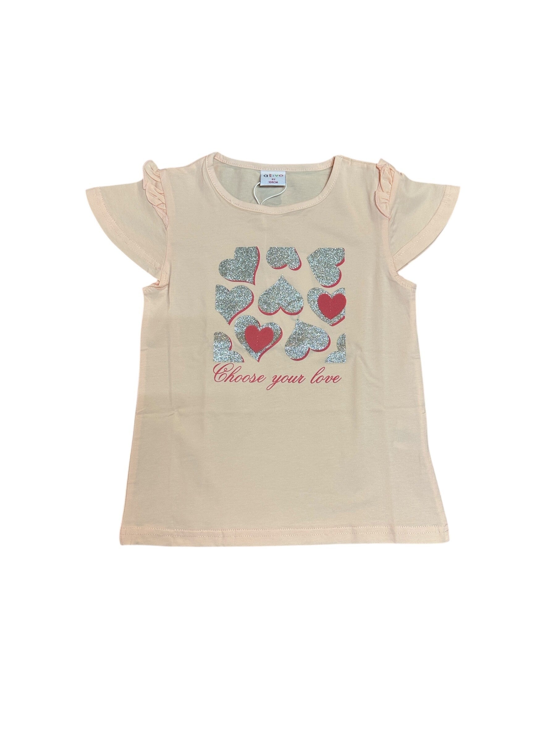T shirt in puro cotone ditta Ativo con cuoricini glitter argento, colore rosa cipria.