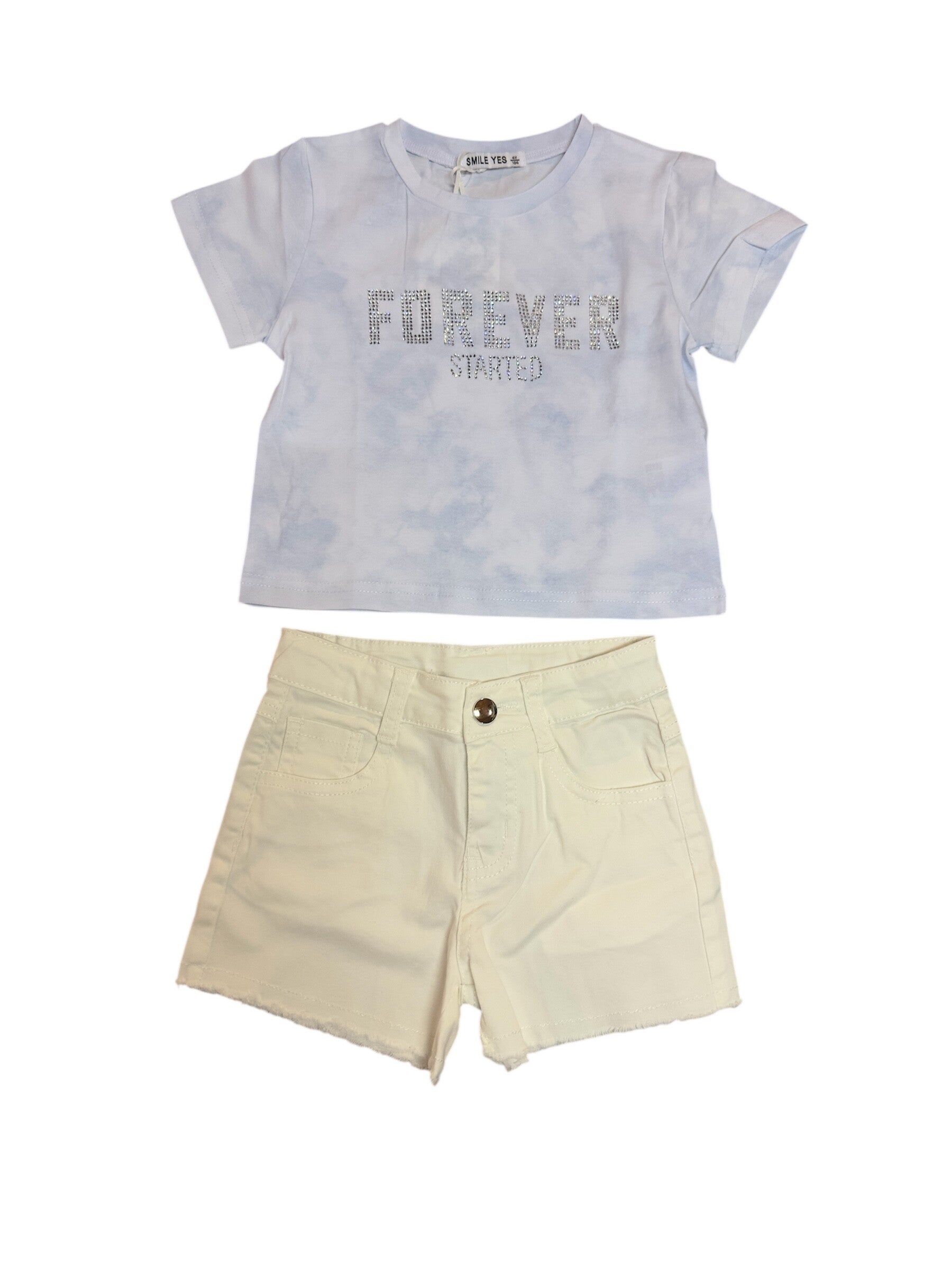 Completo composto da shorts in tessuto bianco elasticizzato con coulisse in vita, t shirt in puro cotone base bianca con azzurro a scatoletta. Da 4 a 12 anni