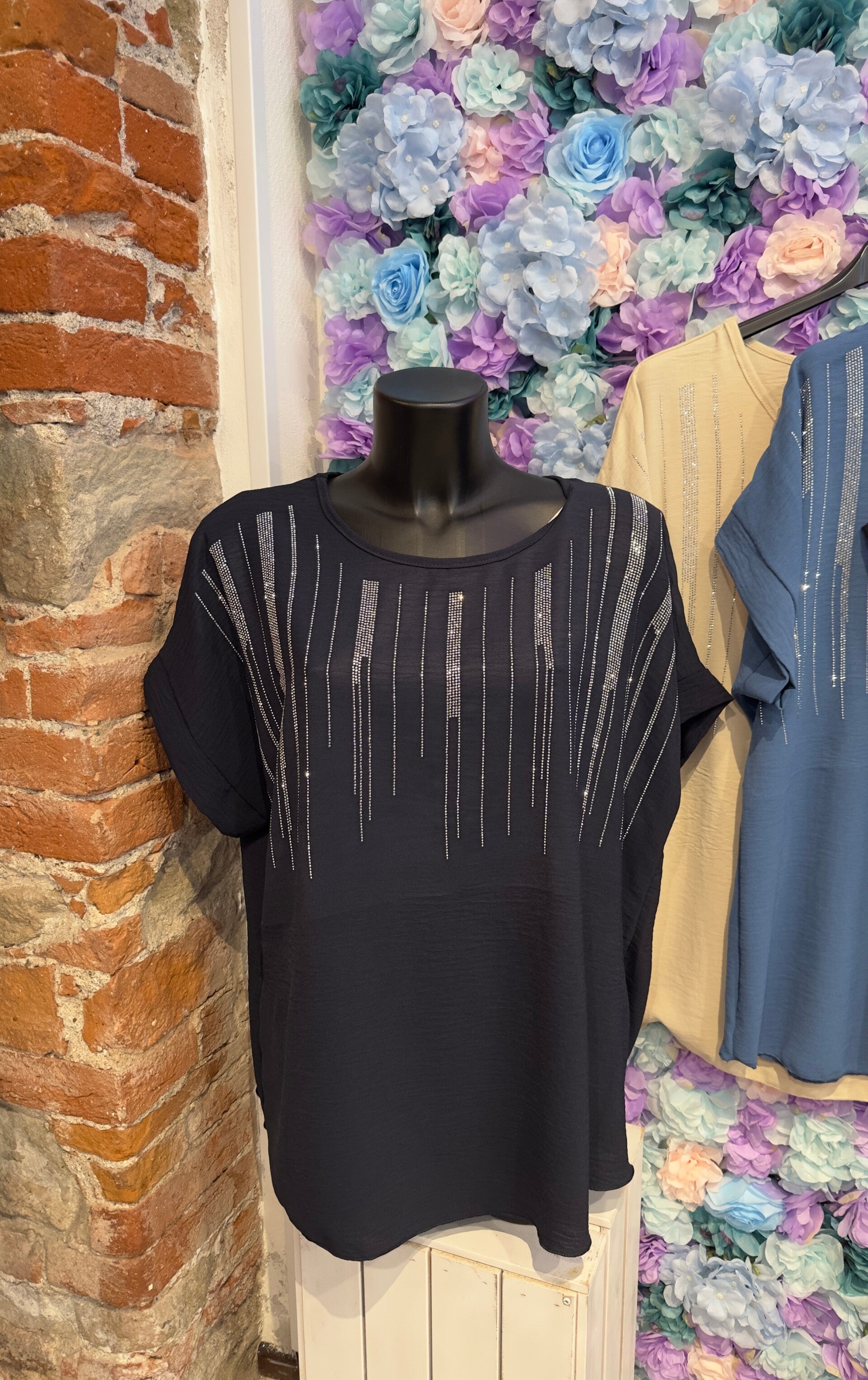 Casacca girocollo con strass argento verticali, taglia unica vestibilita comoda (veste da M a XL)