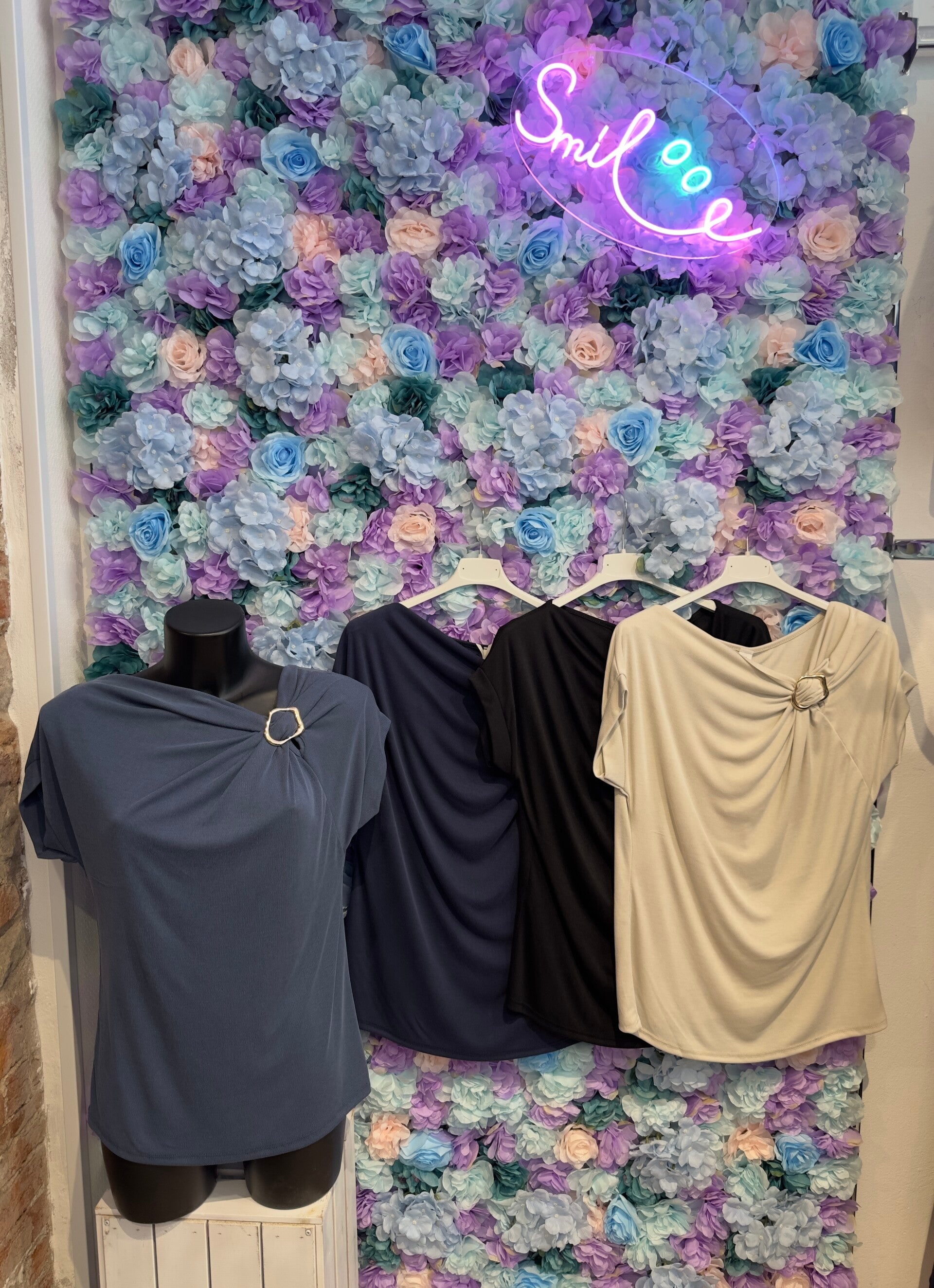 Casacca taglia unica elasticizzata (veste da S a XL)impreziosita da un anello su spalla che la rende elegante.