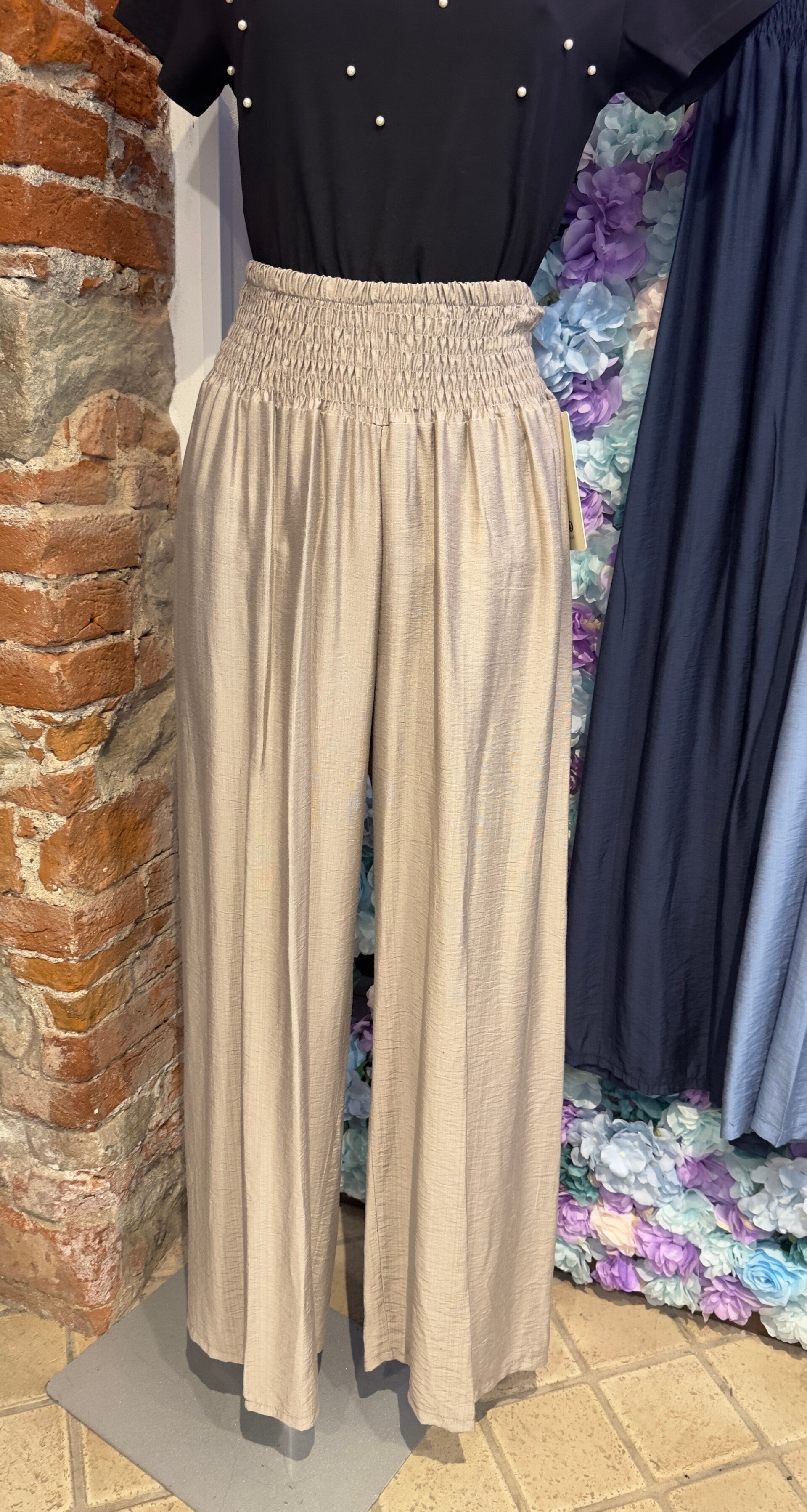 Pantalone gamba larga super fresco e comodo, elasticizzato in vita con nido d ape, tg unica (veste da S a XL)
