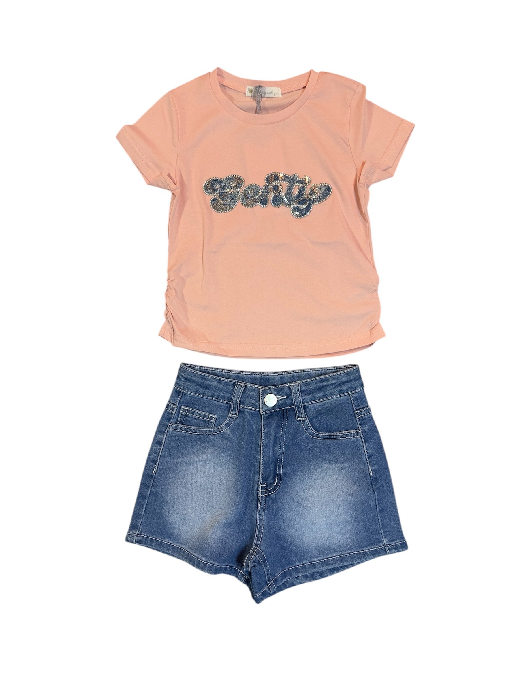 Completo composto da t shirt in cotone e shorts in jeans con coulisse in vita, disponibile in rosa o bianco, da 4 a 12 anni