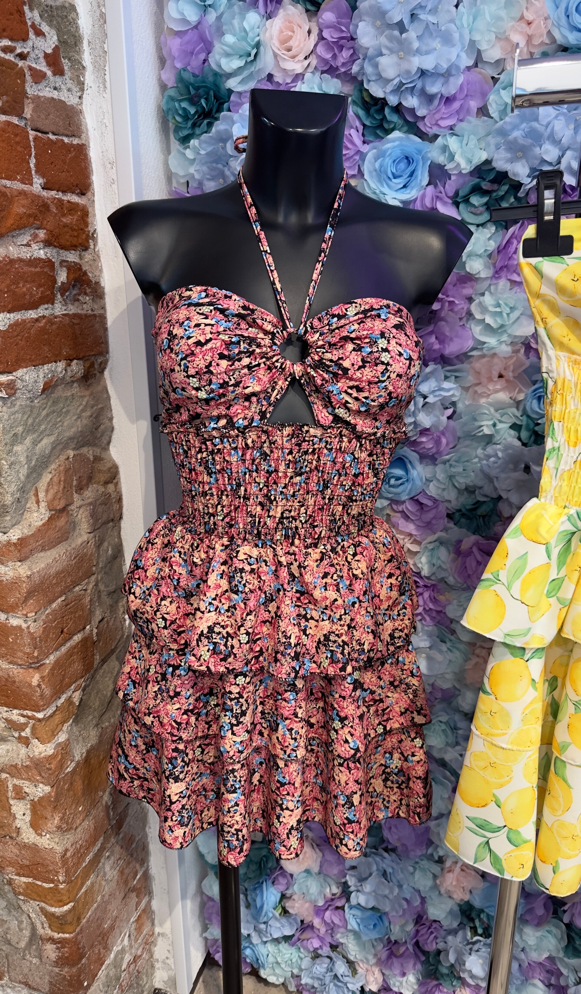 Abito elasticizzato in vita con nido d ape, tg unica, con coppe inserite e laccio dietro a schiena. Diversi colori