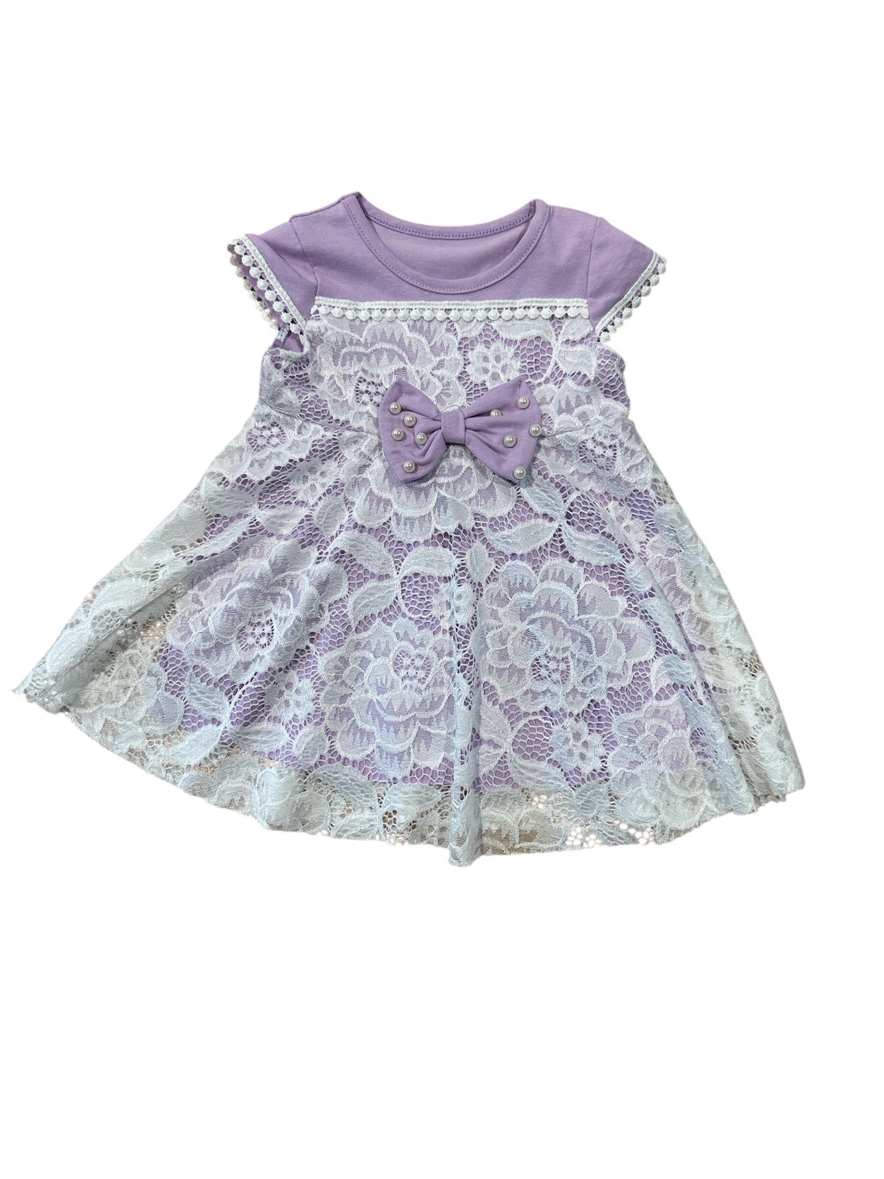 Abito effetto elegante ma comodo con corpetto in cotone lilla e pizzo, da 12 a 36 mesi vestibilita comoda.