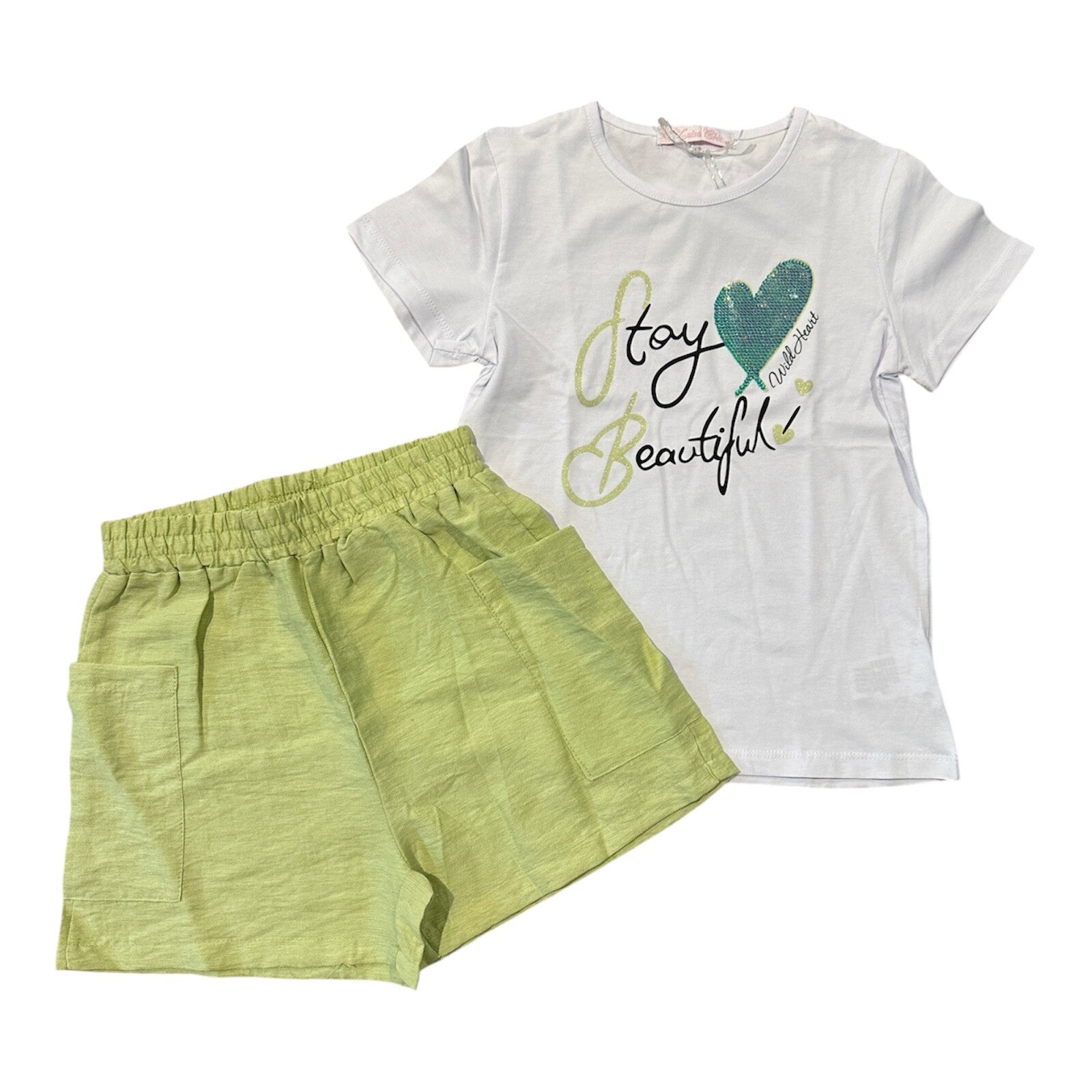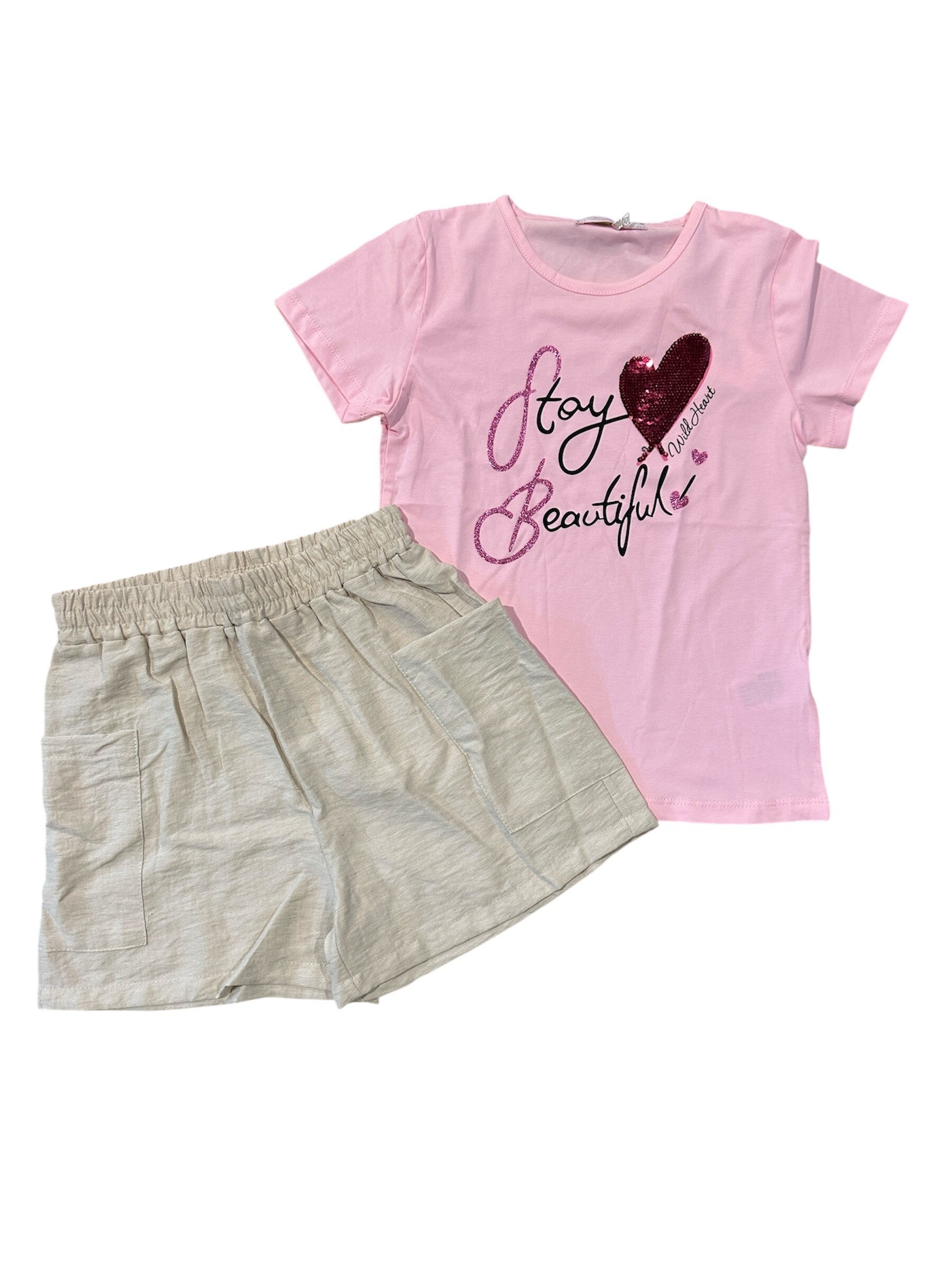 Completo in cotone composto da t shirt con pauettes e shorts morbidi effetto lino. Disponibile in 2 colori da 8 a 16 anni