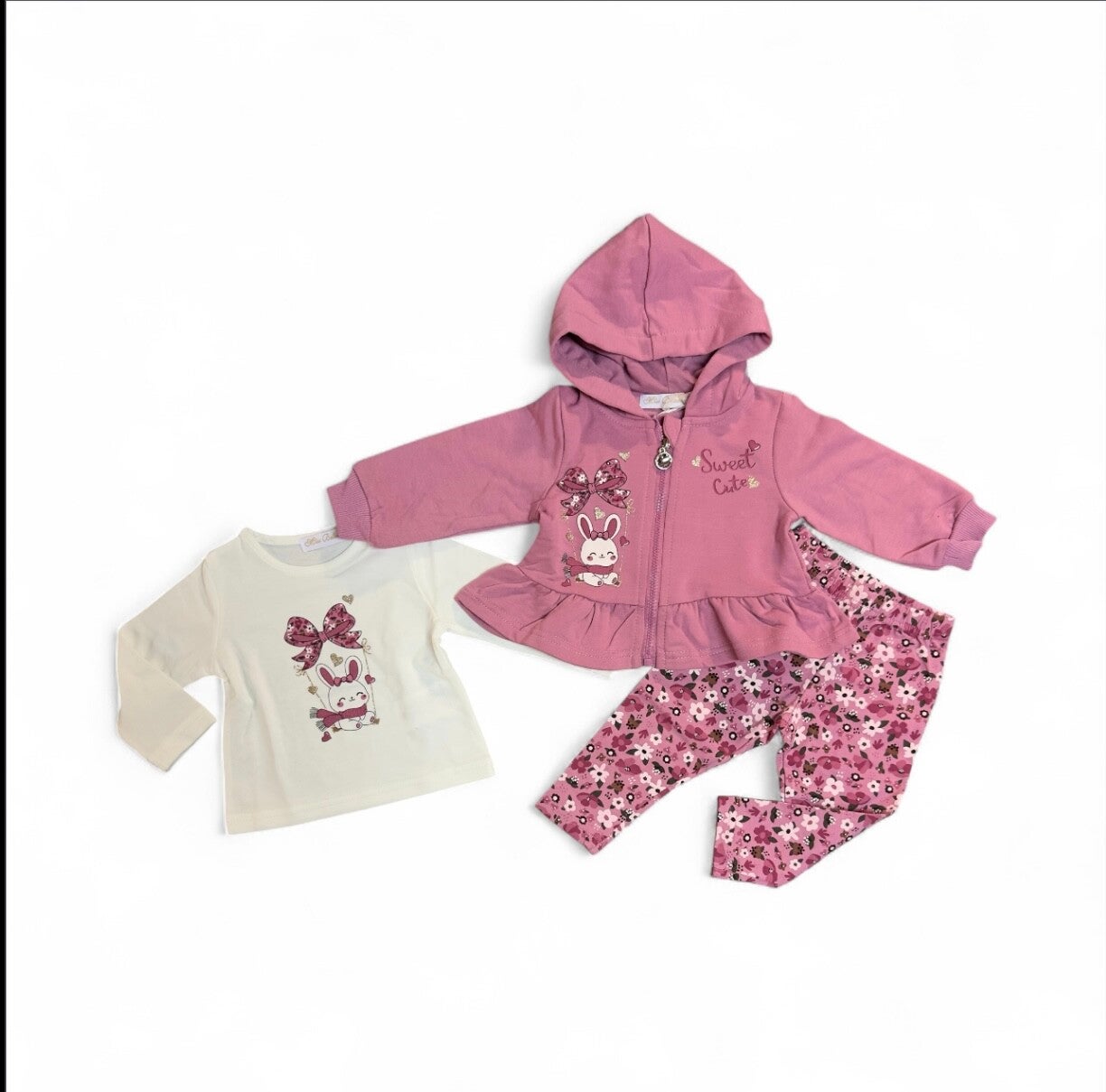 Tuta caldo cotone composta da felpa con zip e cappuccio, maglia manica lunga e leggins floreale. Da 3 a 18 mesi. 2 colori