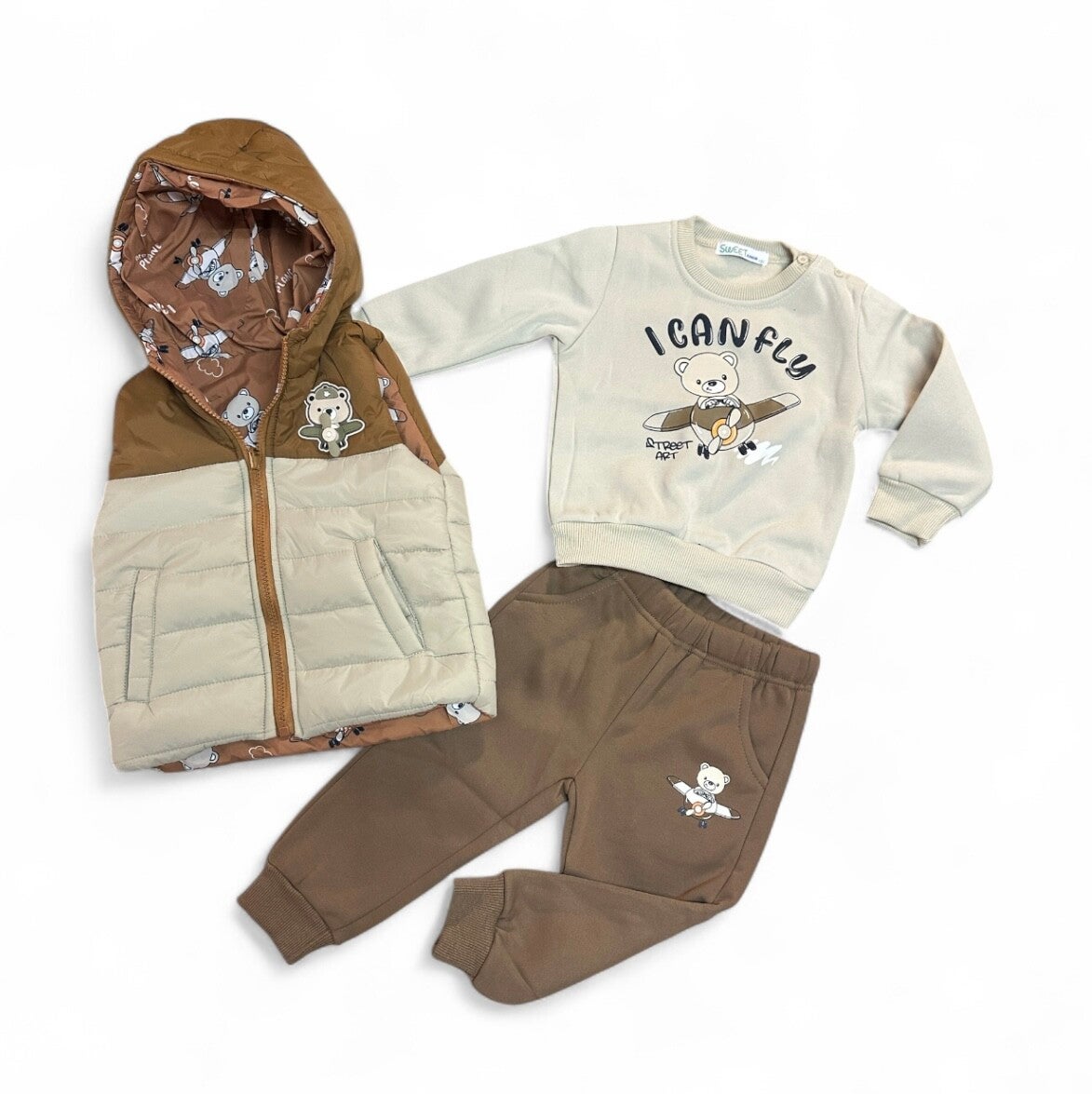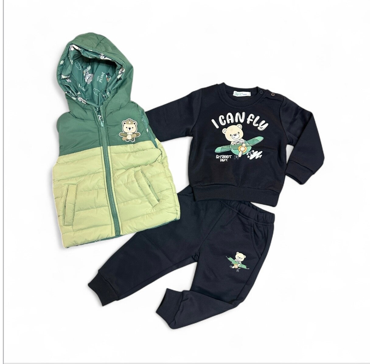 Completo composto da smanicato con cappuccio reversibile. Felpa felpata girocollo e pantalone morbido felpato. Da 12 a 36 mesi disponibile in 2 colori