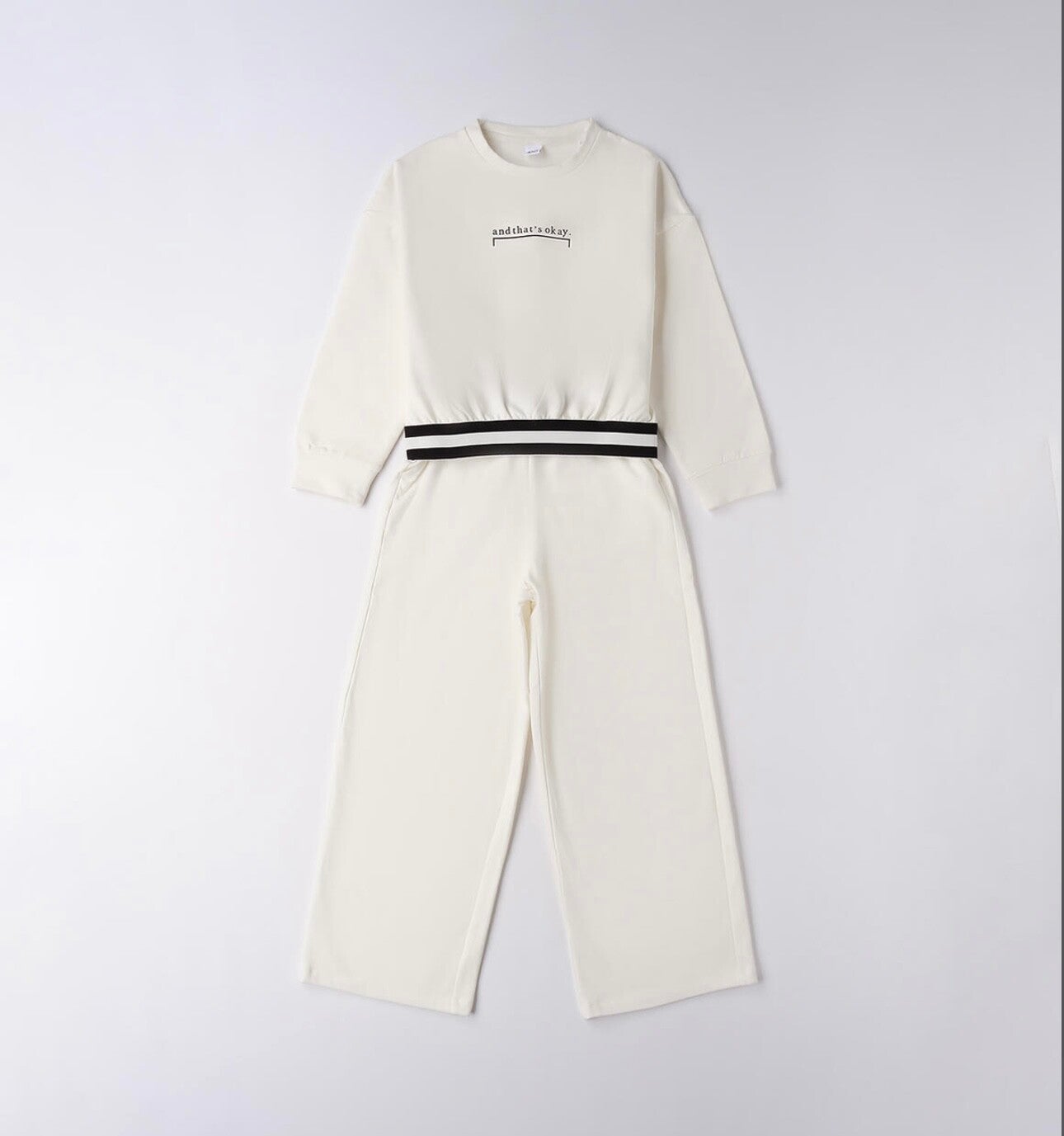 Completo caldo cotone IDo composto da felpa crop girocollo e pantalone gamba Larga. Colore bianco da 8 a 16 anni