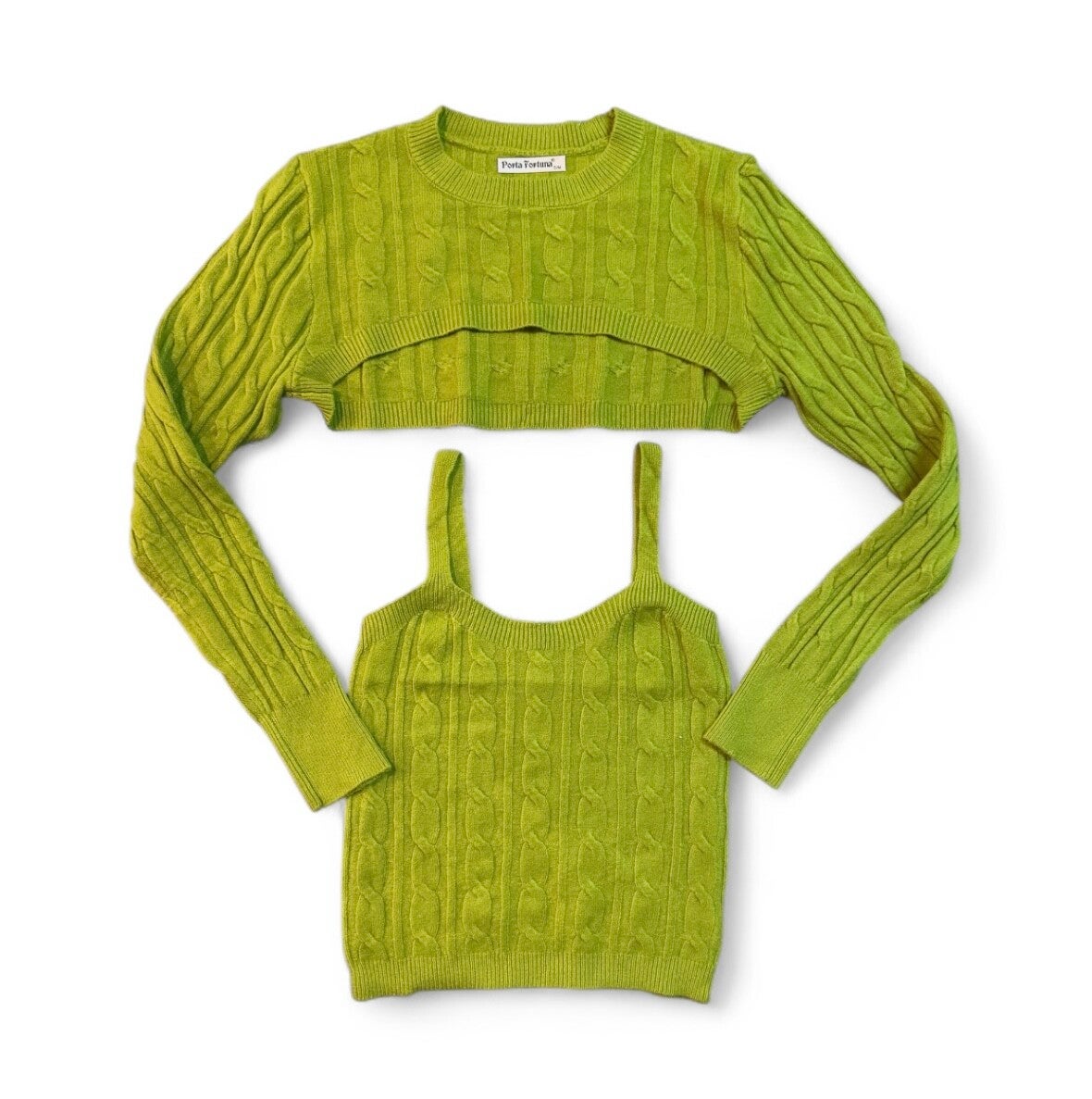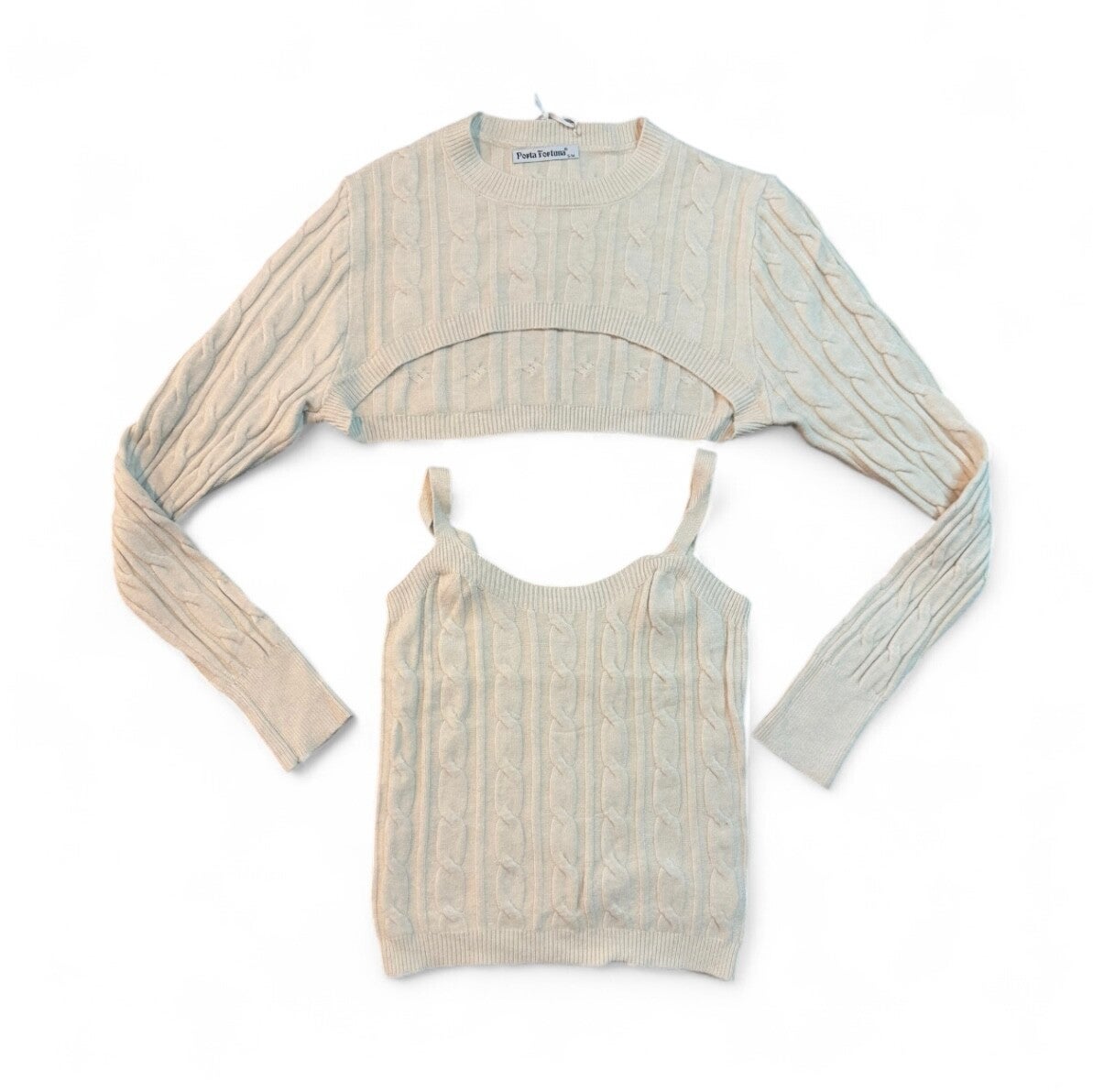 Maglia in morbida viscosa trama nodo composta da canotta con spalline e maniche. Tg unica disponibile in diversi colori
