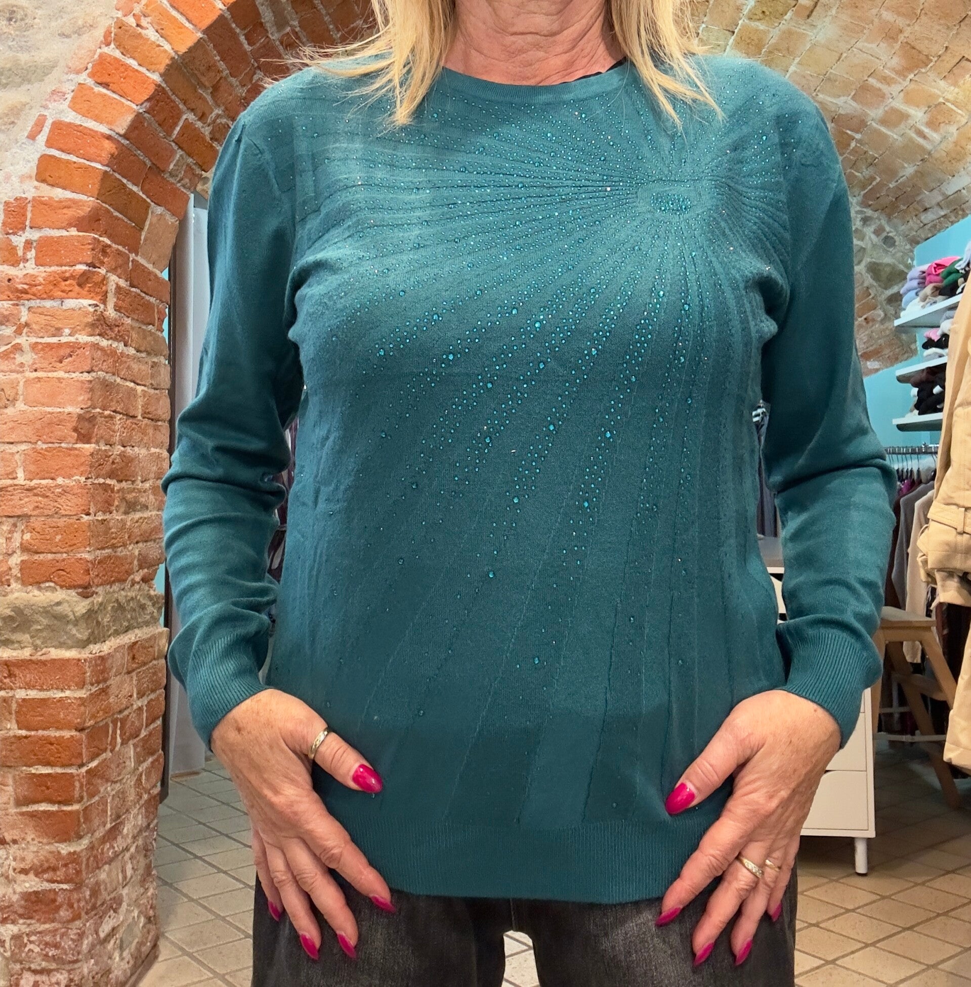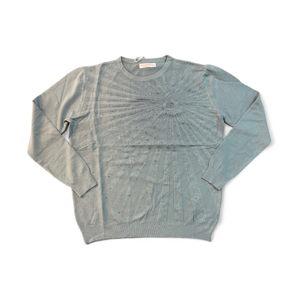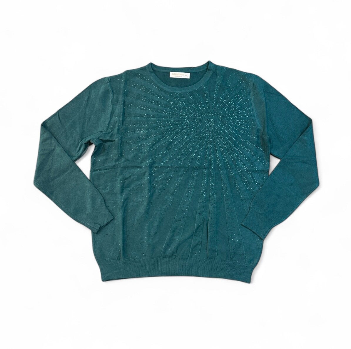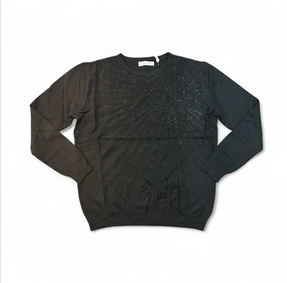 Maglia in morbida viscosa, con decoro di strass tono su tono. Disponibile in M/L o XL/XXL e in diversi colori