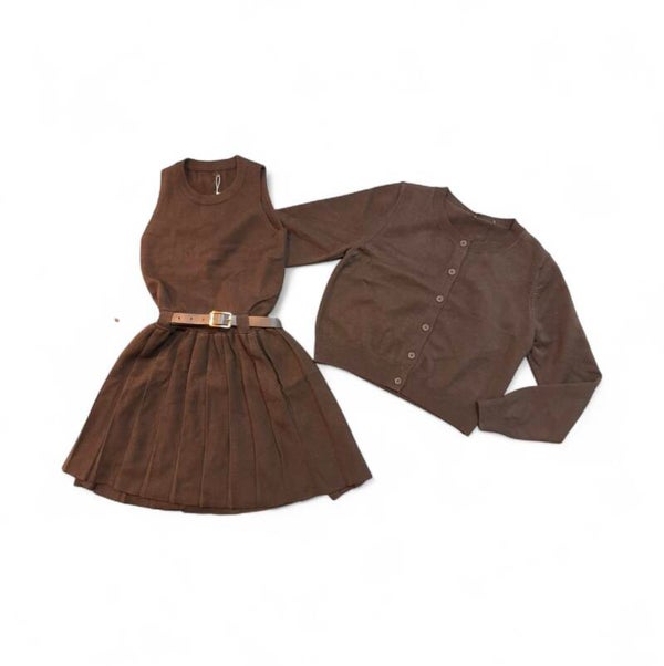 Completo composto da abito smanicato con gonna a pieghe e cintura tono su tono, Giacchetto o con bottoni stesso colore. In morbida viscosa. Tg unica elasticizzata.