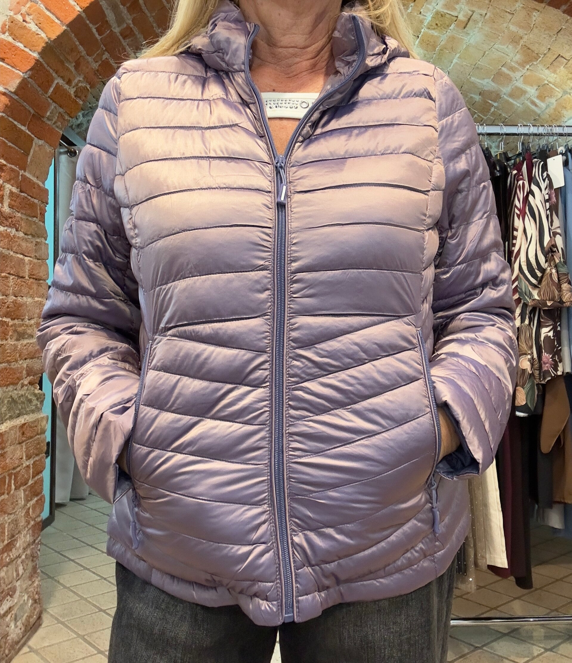 Giubbino 100 grammi resistente a acqua e pioggia, con cappuccio viola metallizzato. Da M a XL