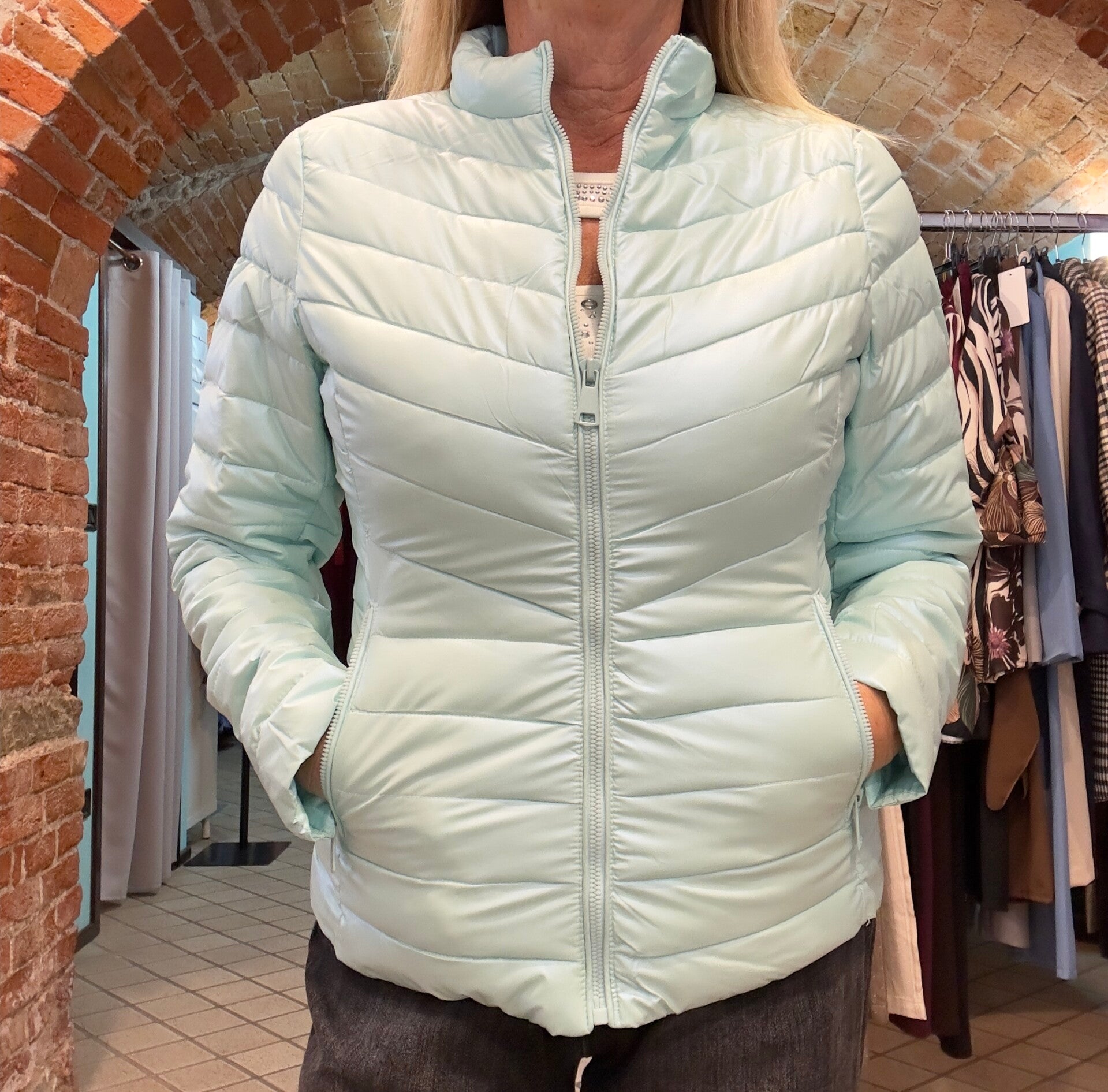 Giubbino 100 grammi resistente a acqua e vento, colore tiffany metallizzato. Senza cappuccio da XS a L
