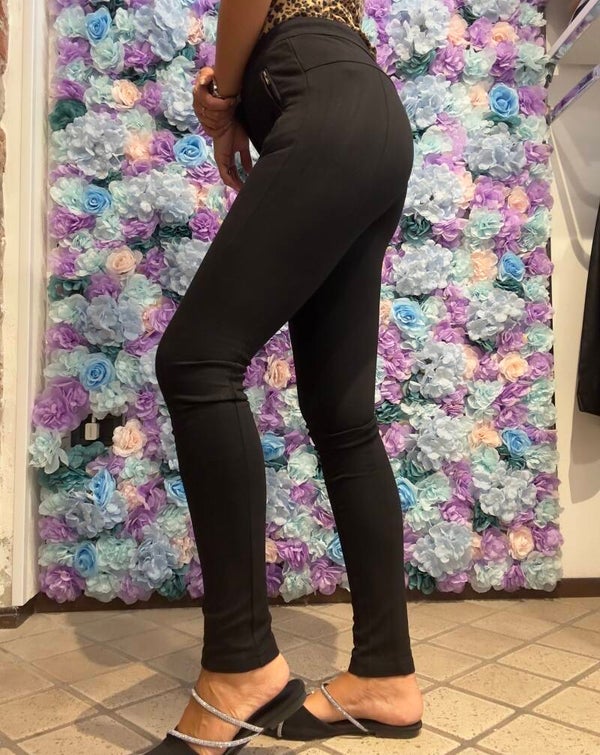 Pantalone in felpa elasticizzato a sigaretta, con zip e bottone. Comodo ma elegante. Da S a XL