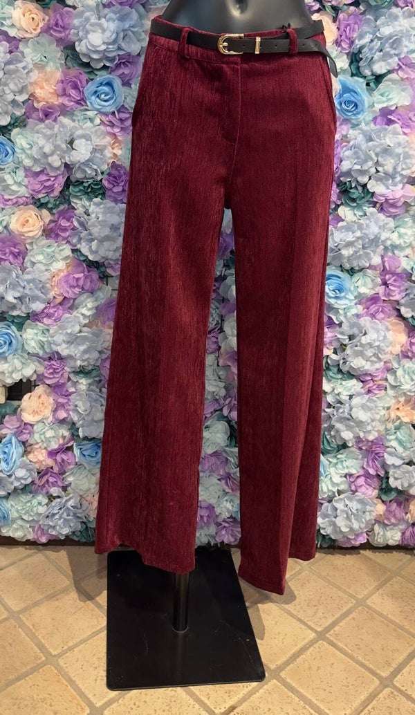 Tailleur in velluto composto da blazer struttura regolare e pantalone gamba larga con cintura. Disponibile in bordeaux e burro, da S a XXL (vendibili anche separatamente: blazer €29,50 - pantalone €29,50)