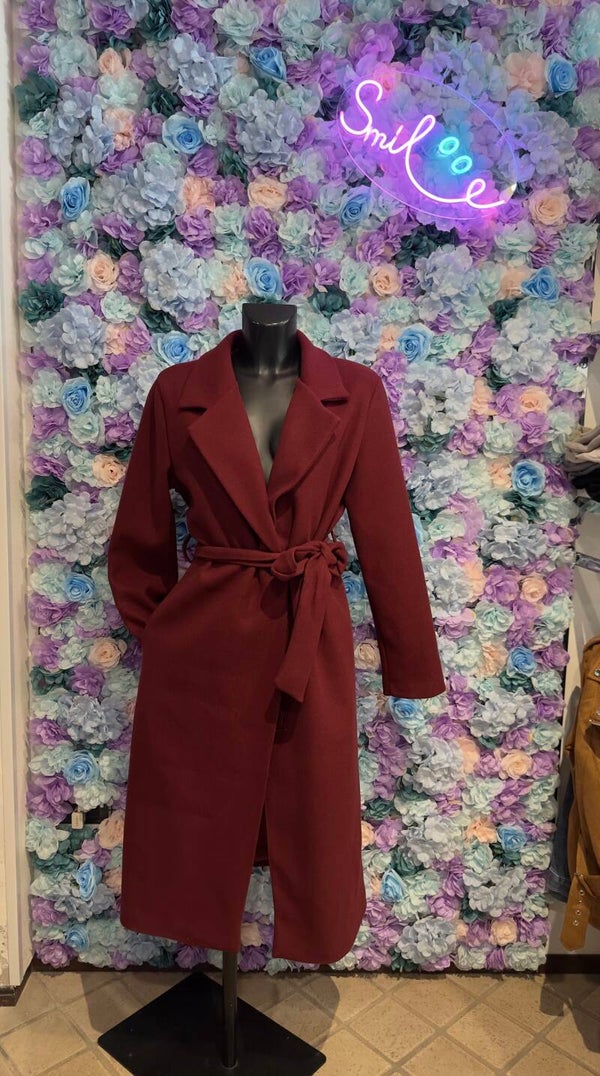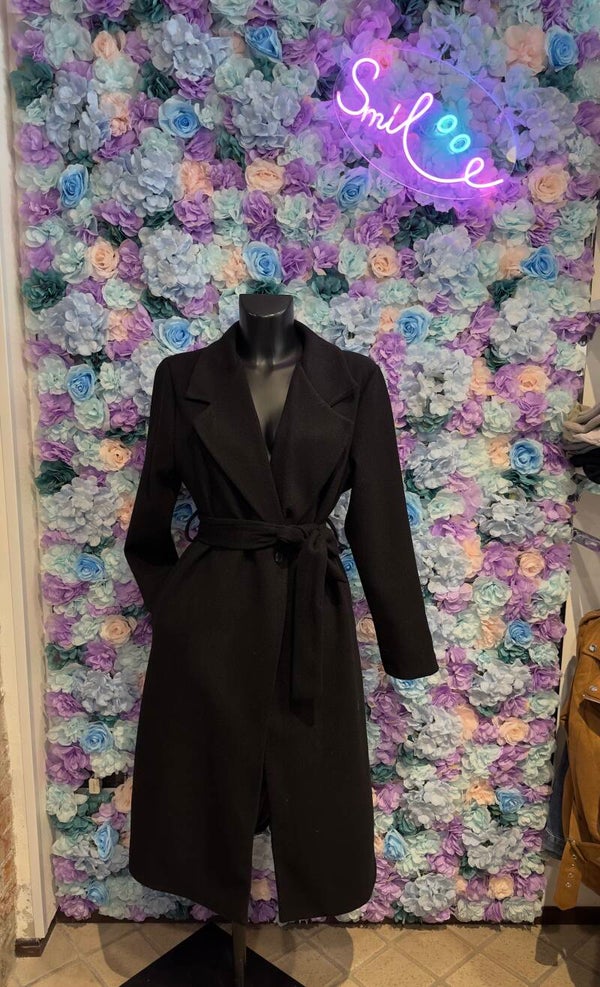 Cappotto semplice in panno cotg unica con cintura da stringere in vita e tasche. Modello lungo disponibile in vari colori