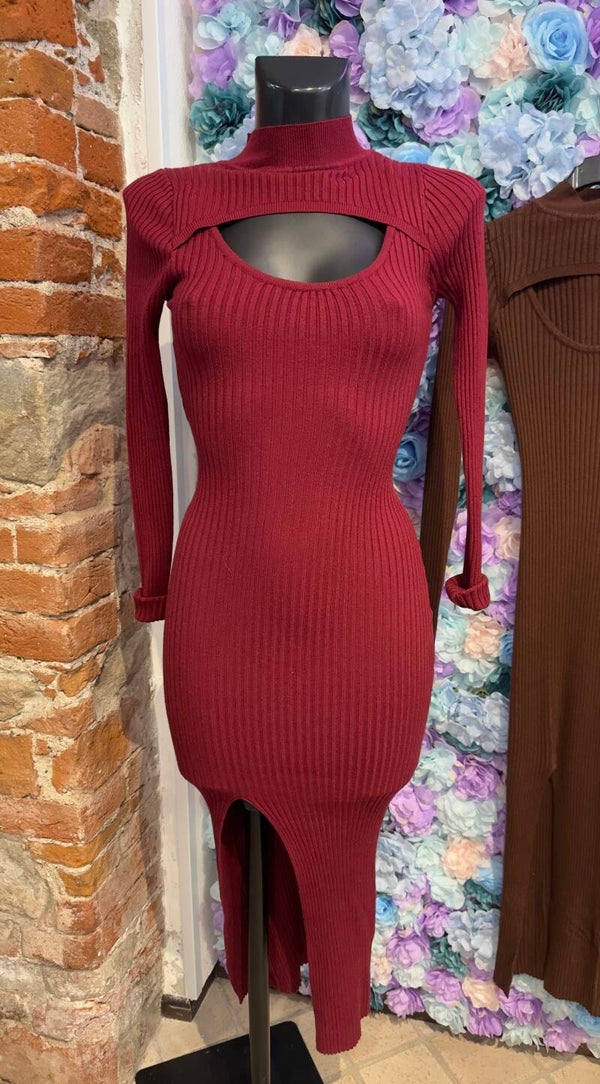 Abito a costine in viscosa aderente con goccia e spacco. Tg unica disponibile in 3 colori