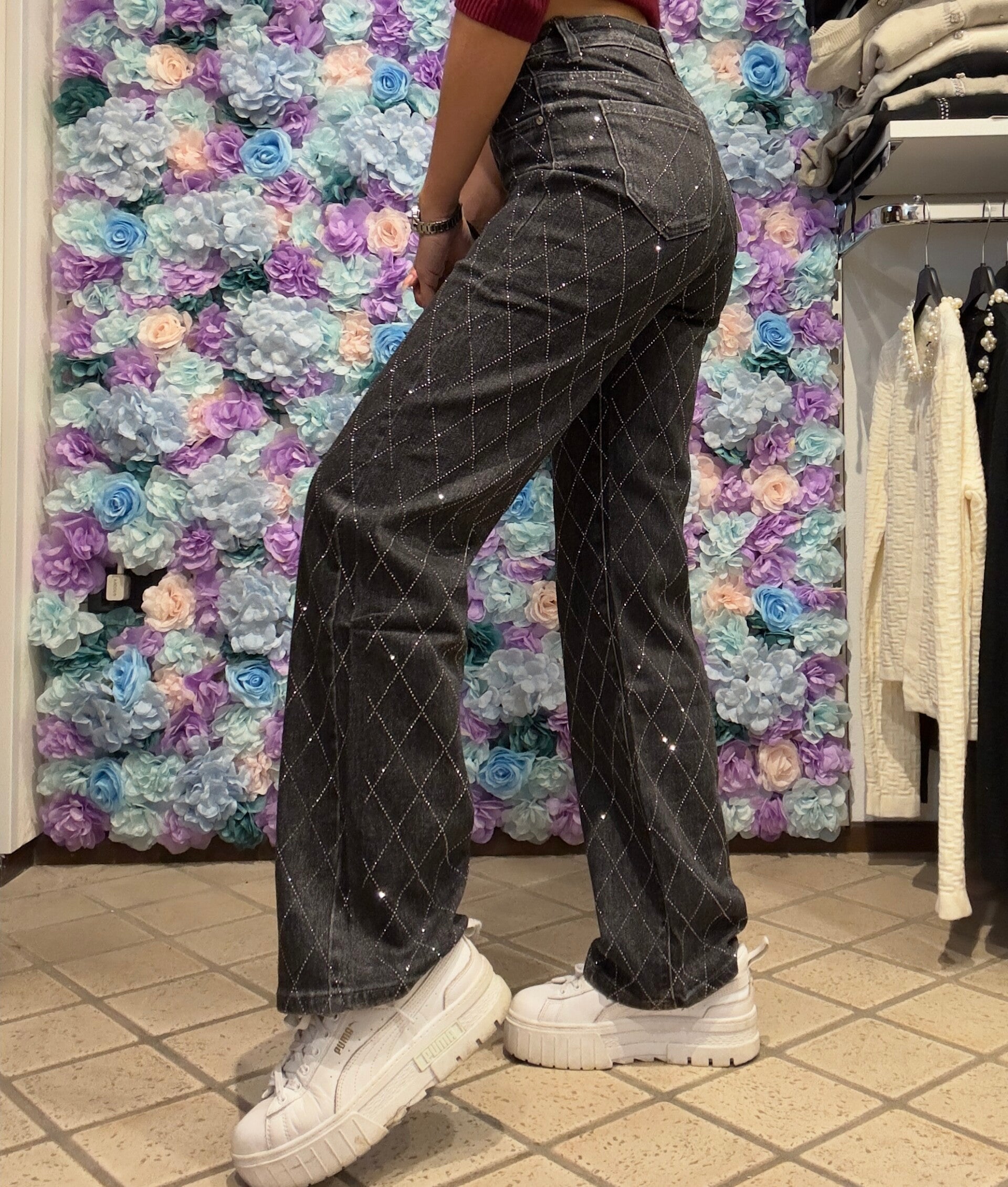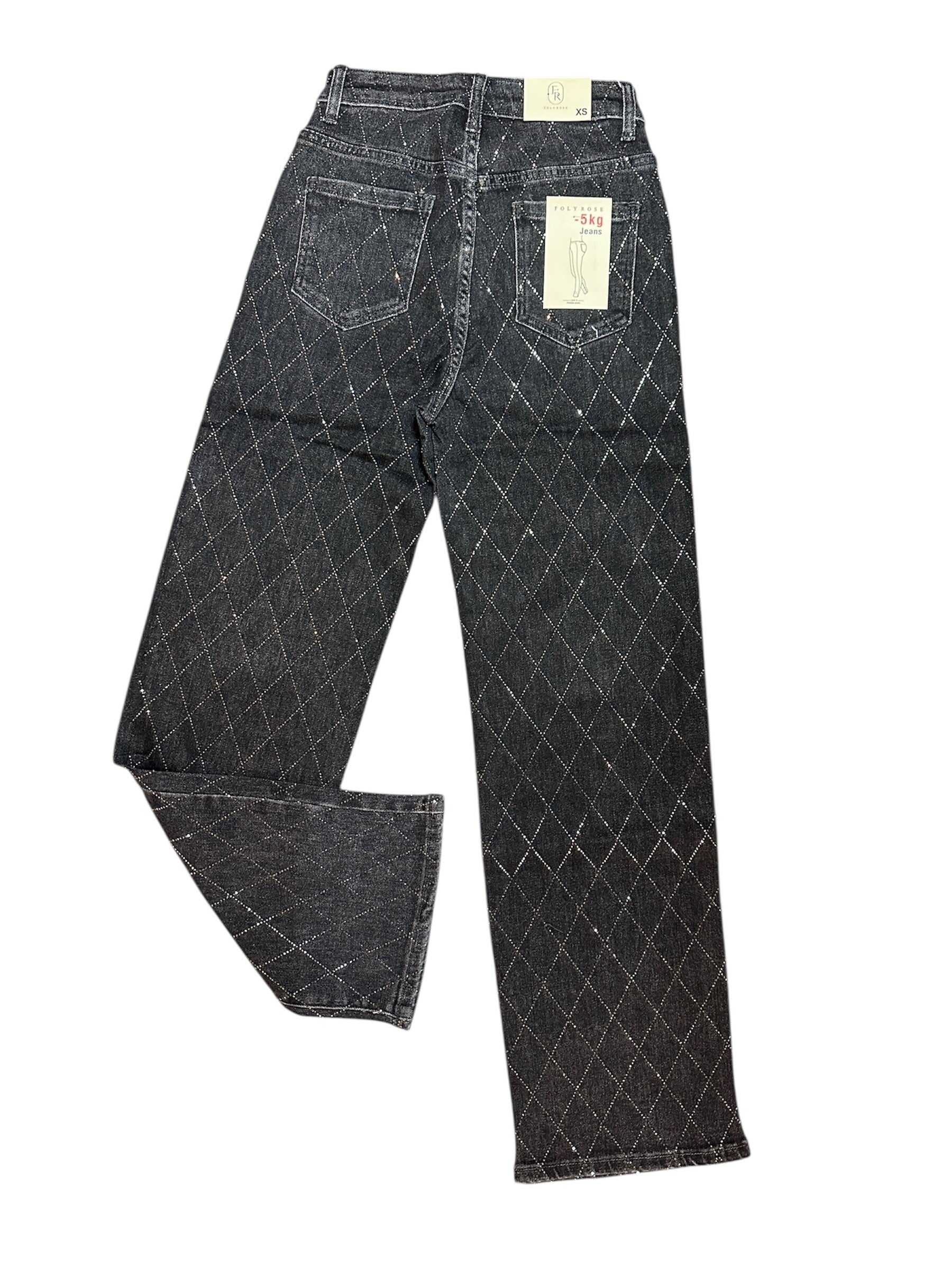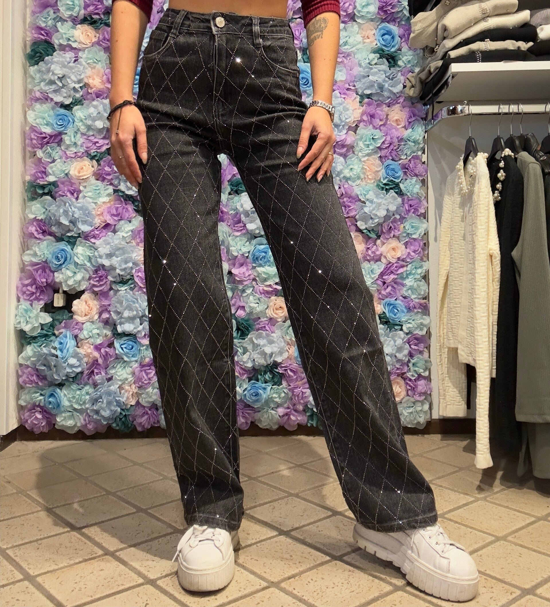 Jeans nero elasticizzato gamba larga con rombi lurex. Perfetto casual o elegante. Da XS a XL