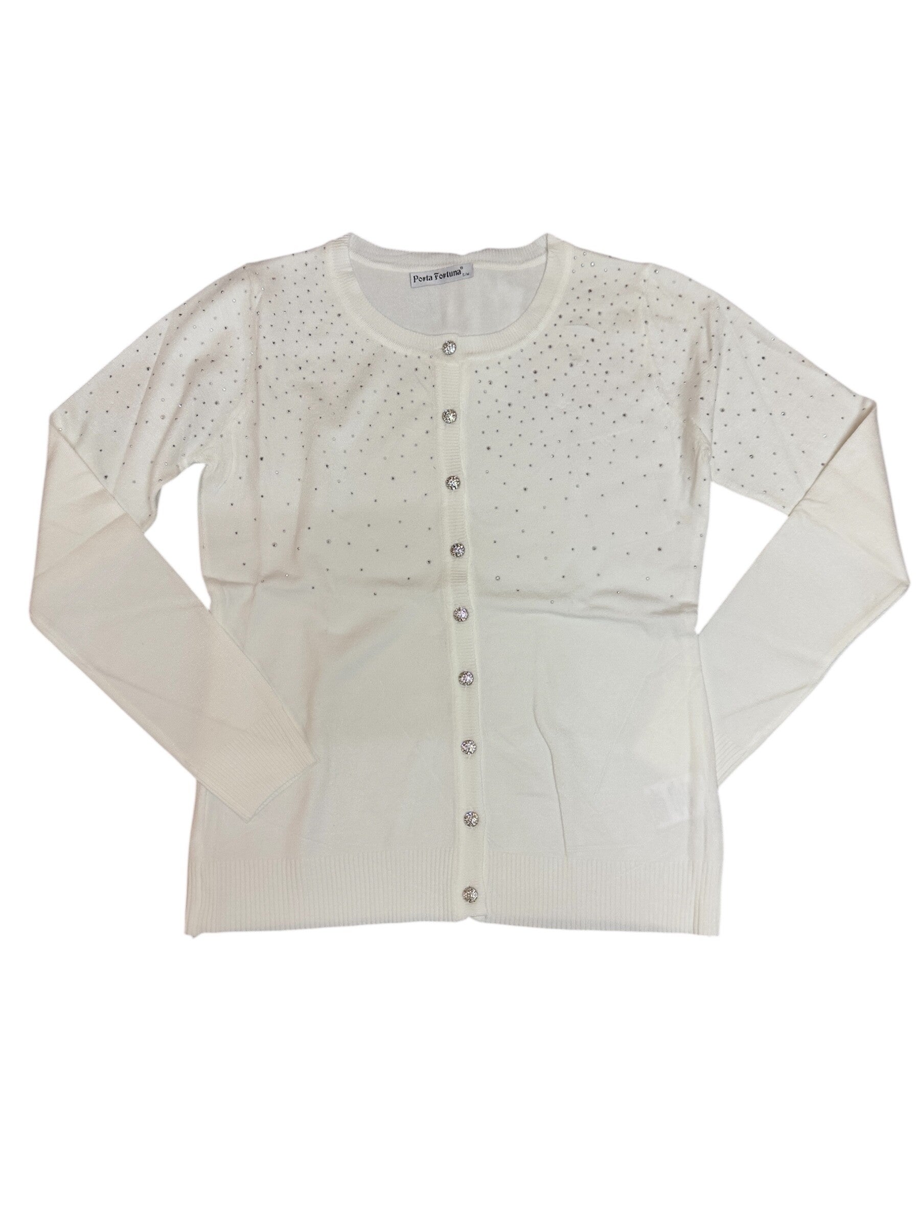 Cardigan in morbida viscosa, girocollo con bottoni Swarovski. Struttura regolare disponibile in diversi colori S/M o L/XL