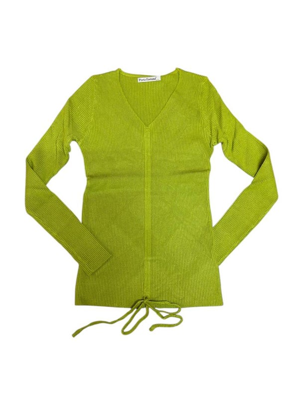 maglia in morbida viscosa a costine scollo a V con lacci decorativi in mezzo, che si possono tirare per accorciare la maglia. Diversi colori tg S/M o L/XL vestibilita slim