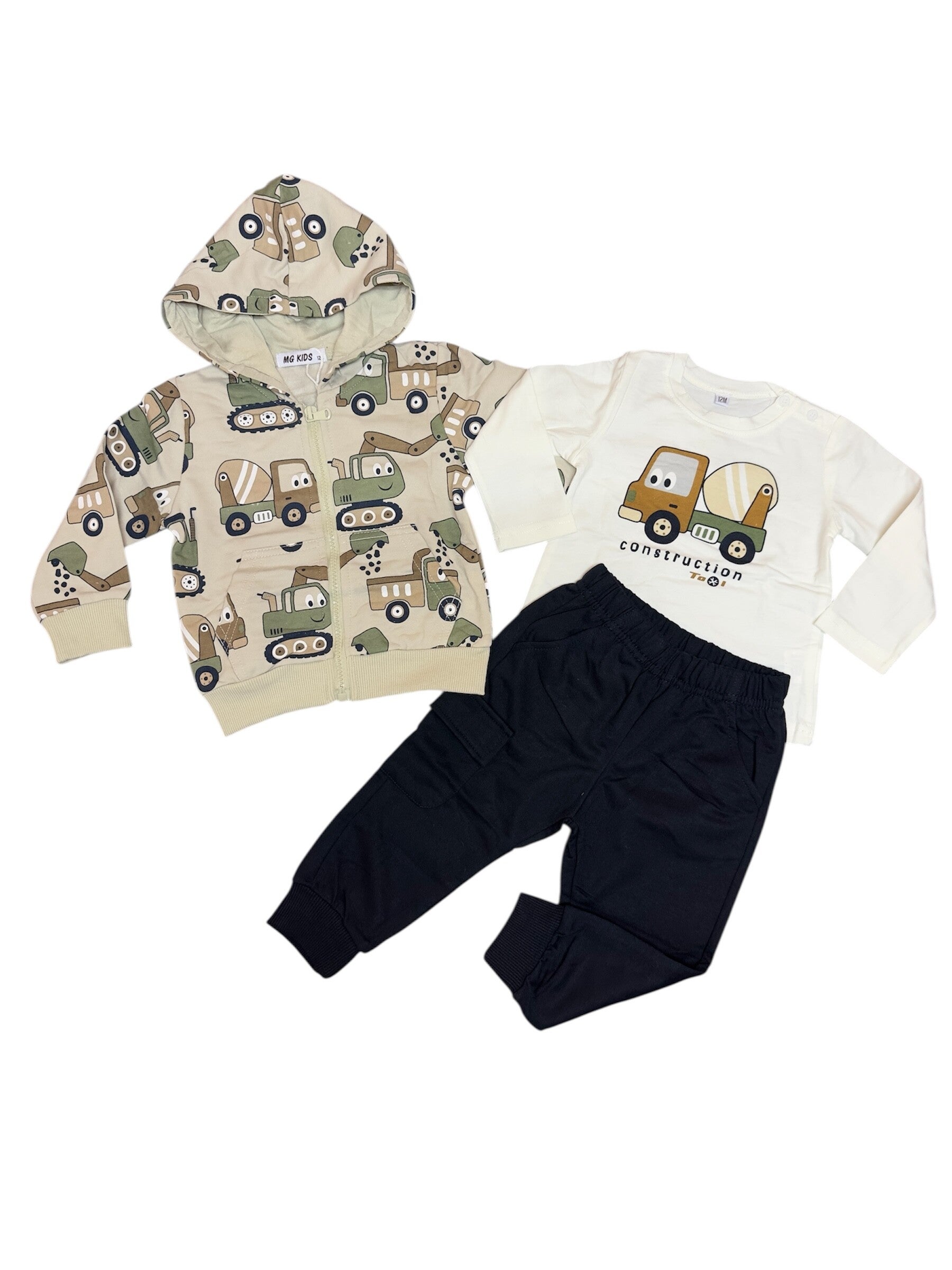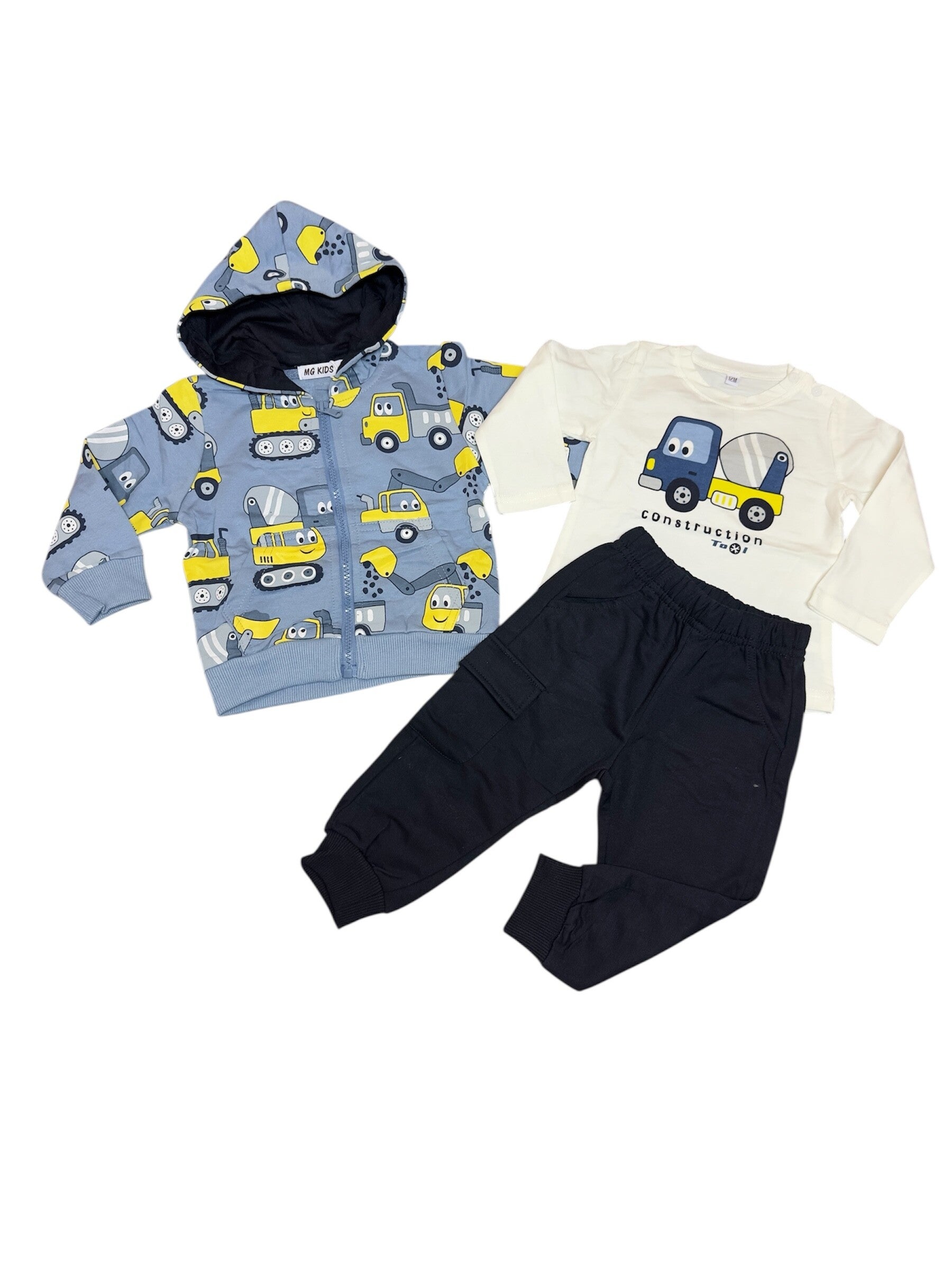 Tuta in caldo cotone composta da felpa con zip e cappuccio, maglia girocollo e pantalone con polsino. Da 1 a 3 anni, diversi colori. stampa trattore