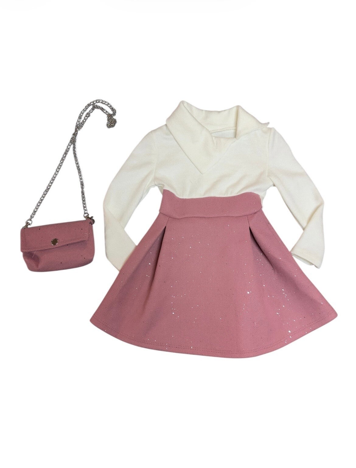 Abito sfizioso e comodo, con gonna in panno rosa e lurex. Borsetta abbinata. Da 2 a 12 anni