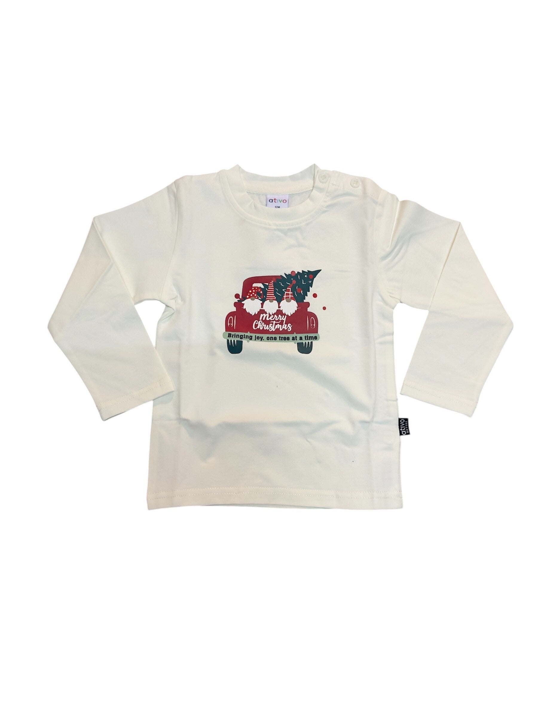 Maglia girocollo in caldo cotone Ativo. Disponibile solo n rosso con stampa pupazzo, bianco con stampa auto natalizia. Unisex da 6 a 36 mesi