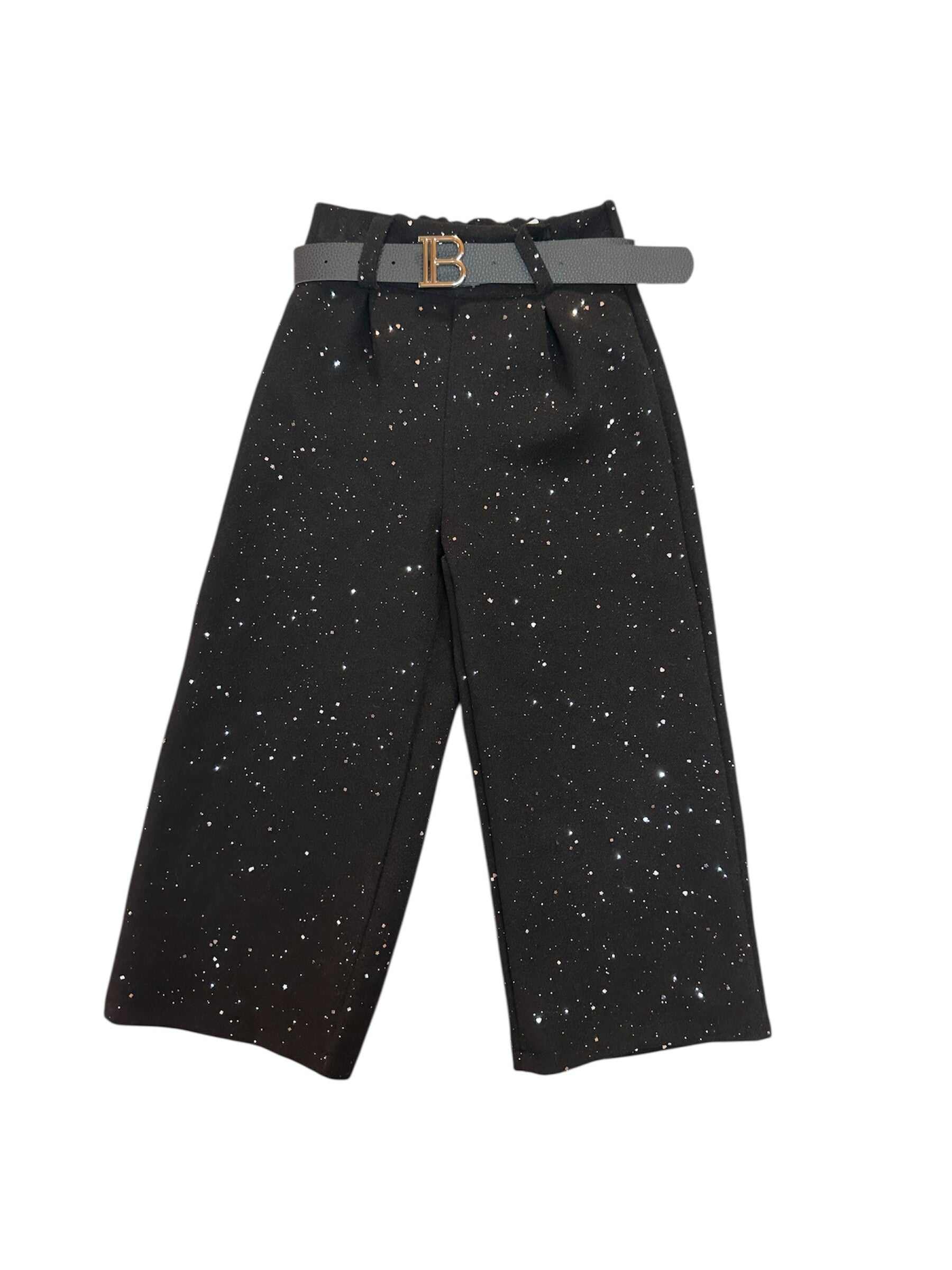 Pantalone in caldo panno elasticizzato in vita gamba larga, nero con brillantini argento. Da 4 a 14 anni
