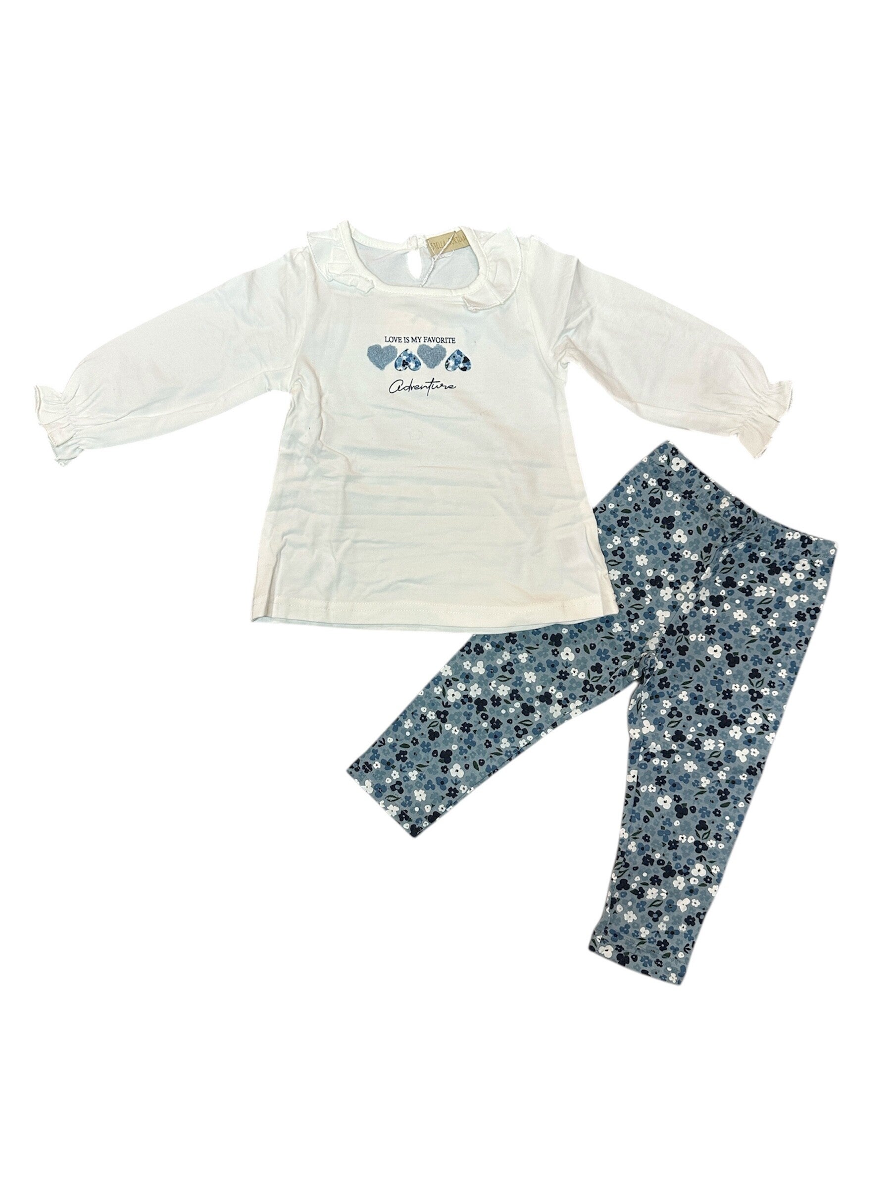 Completo in caldo cotone composto da maxi maglia sfiziosa e leggins in fantasia. Disponibile in variante bianco/azzurra o rosa. Da 12 a 36 mesi