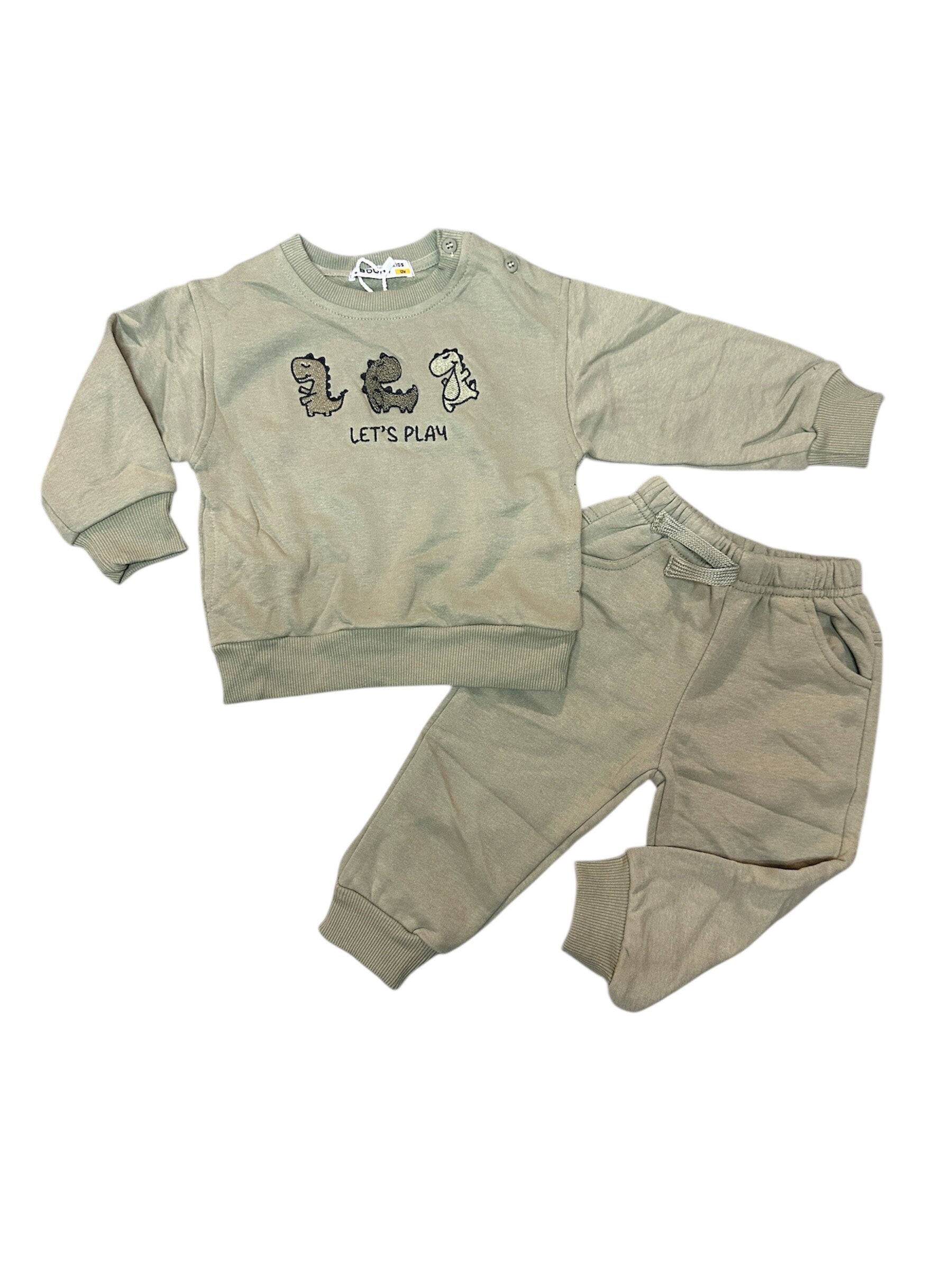 Completo in caldo cotone composto da felpa girocollo e pantalone della tuta. Disponibile in bordeaux/blu o verde salvia. Da 12 a 36 mesi
