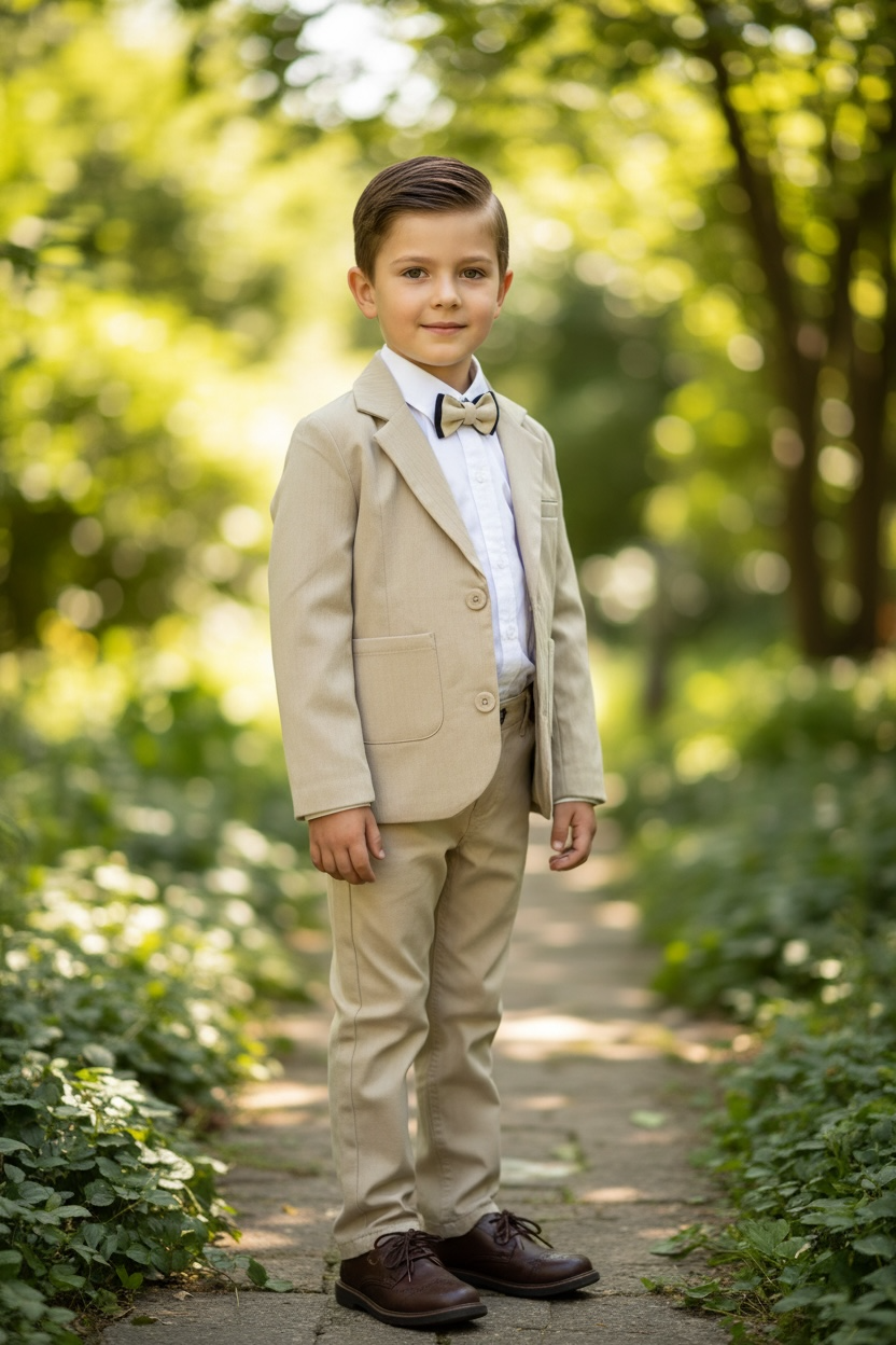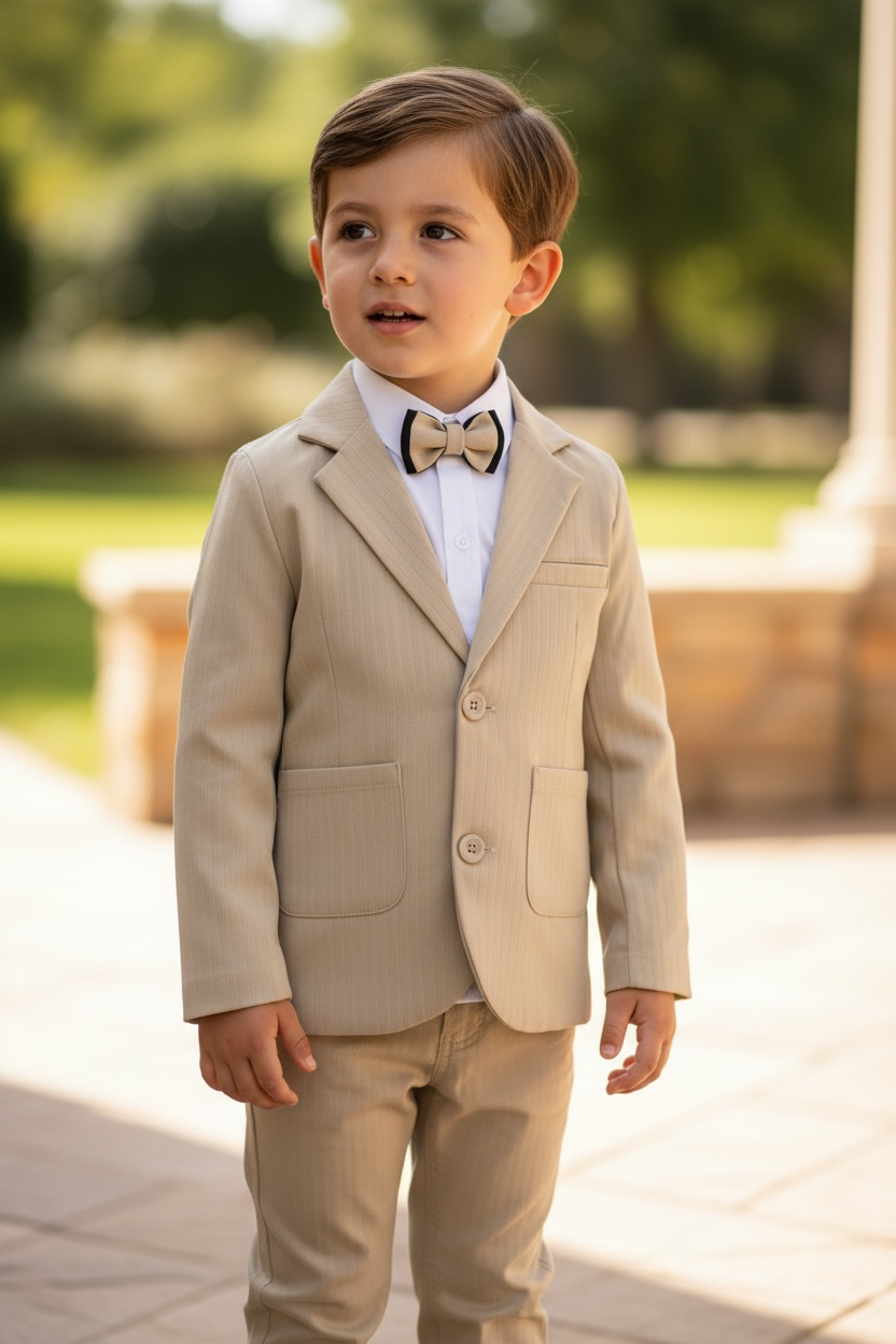 Completo elegante composto da: blazer, camicia bianca con colletto, papillon reversibile da attaccare a bottone, pantaloni con coulisse interna e bottone in vita struttura regolare. Da 4 a 12 anni disponibile in 2 colori